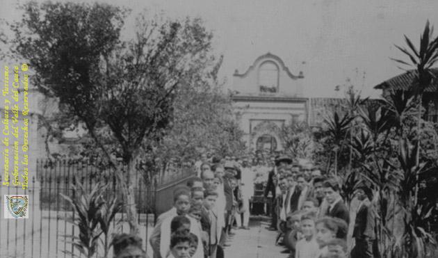 Desfile del funeral del padre Francisco A. Rada, impulsor del desarrollo del pueblo. Entrada a la capilla del cementerio. El Cerrito, C. 1960.