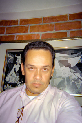| dc.description | Primer Plano. Imagen tomada en interior con luz de flash. Un hombre sostiene la cámara con su brazo izquierdo extendido, la expresión de su rostro es seria. Al fondo una imagen de una pintura a blanco y negro sobre un muro de ladrillo. | spa |