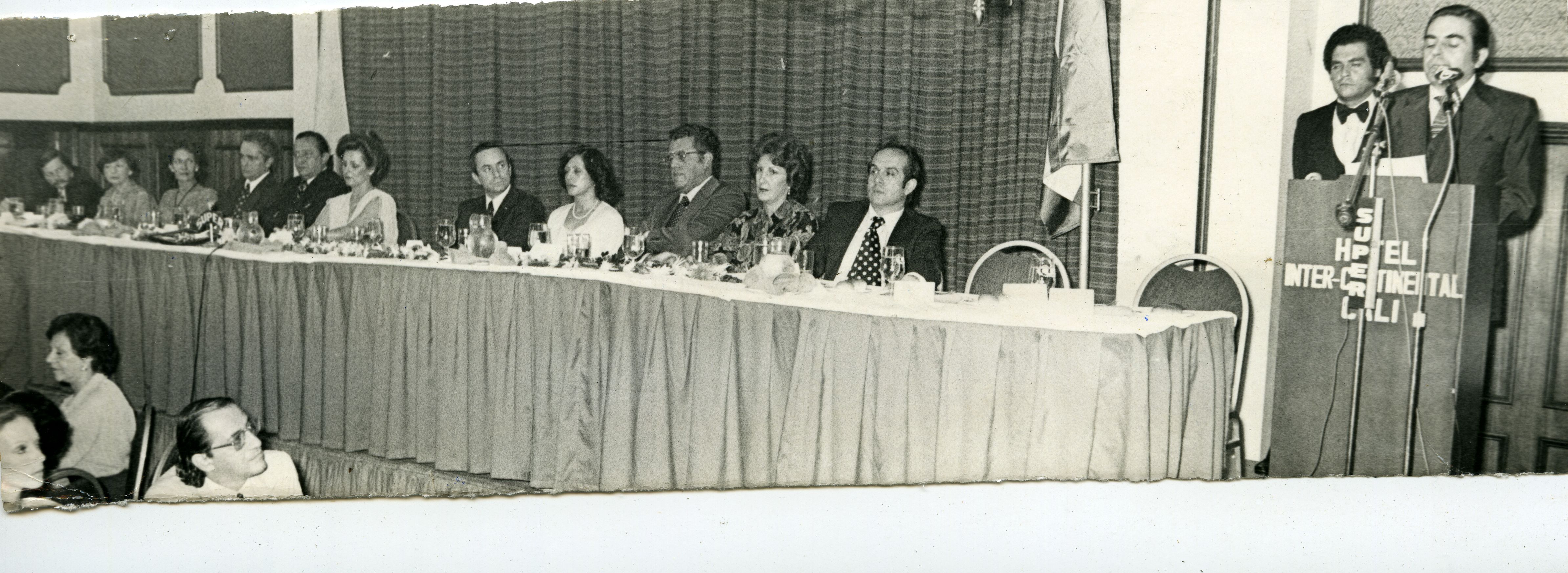 En la mesa principal aparecen de izquierda a derecha: Fabio Rodríguez, Bolivia Ramos de Balcázar, Miryam de Escobar Navia, Raúl Orejuela Bueno, Gustavo Balcázar Monzón, Alma de González Valencia, Jaime Arizabaleta Calderón y señora Cecilia de Arizabaleta, Vicente Borrero Velasco y señora Yolanda de Borrero Y jorge M Eastman, durante la intervención del alcalde Ernesto González Caicedo en el homenaje que se rindió por los 2 años de su brillante administración municipal.