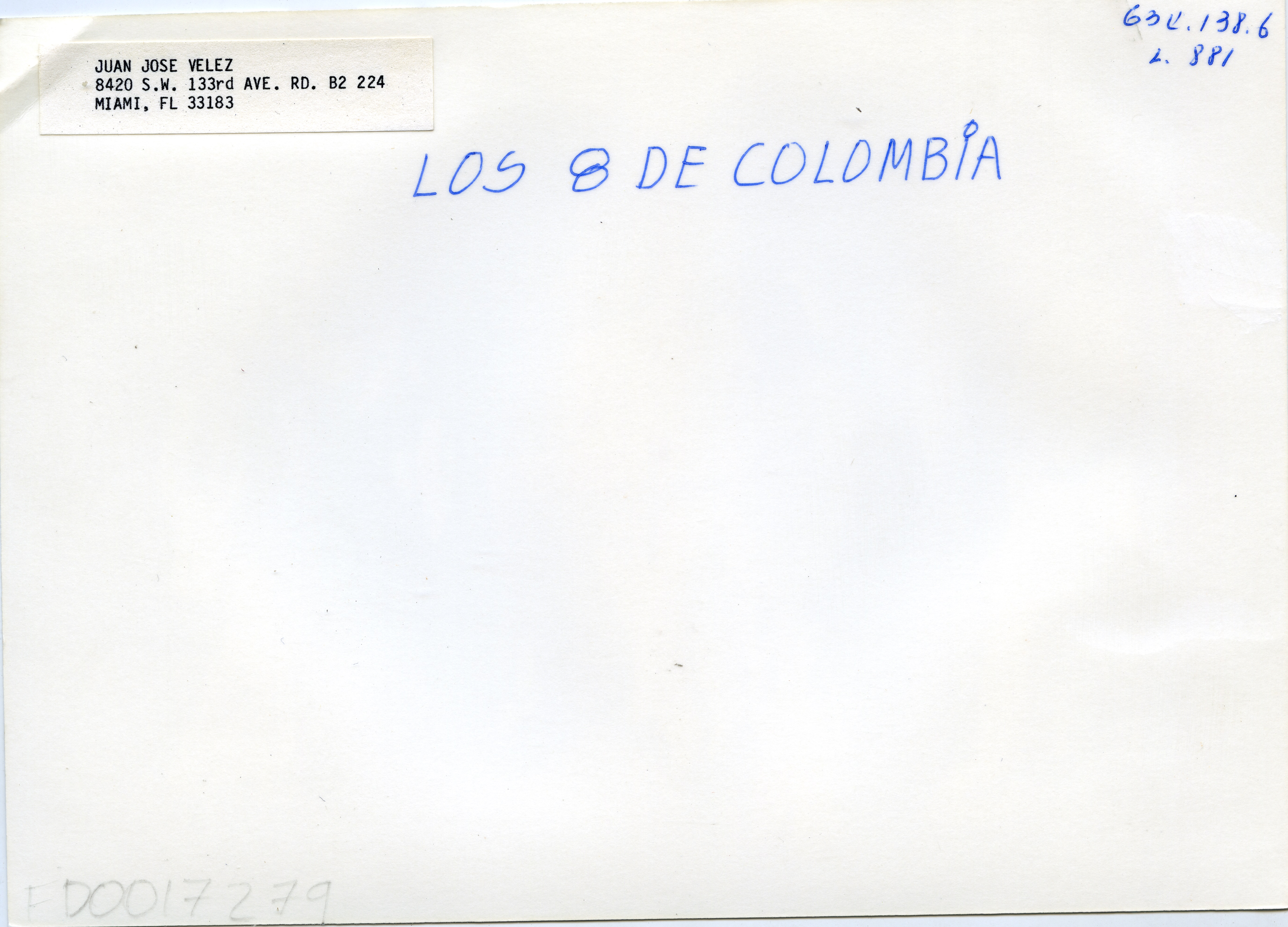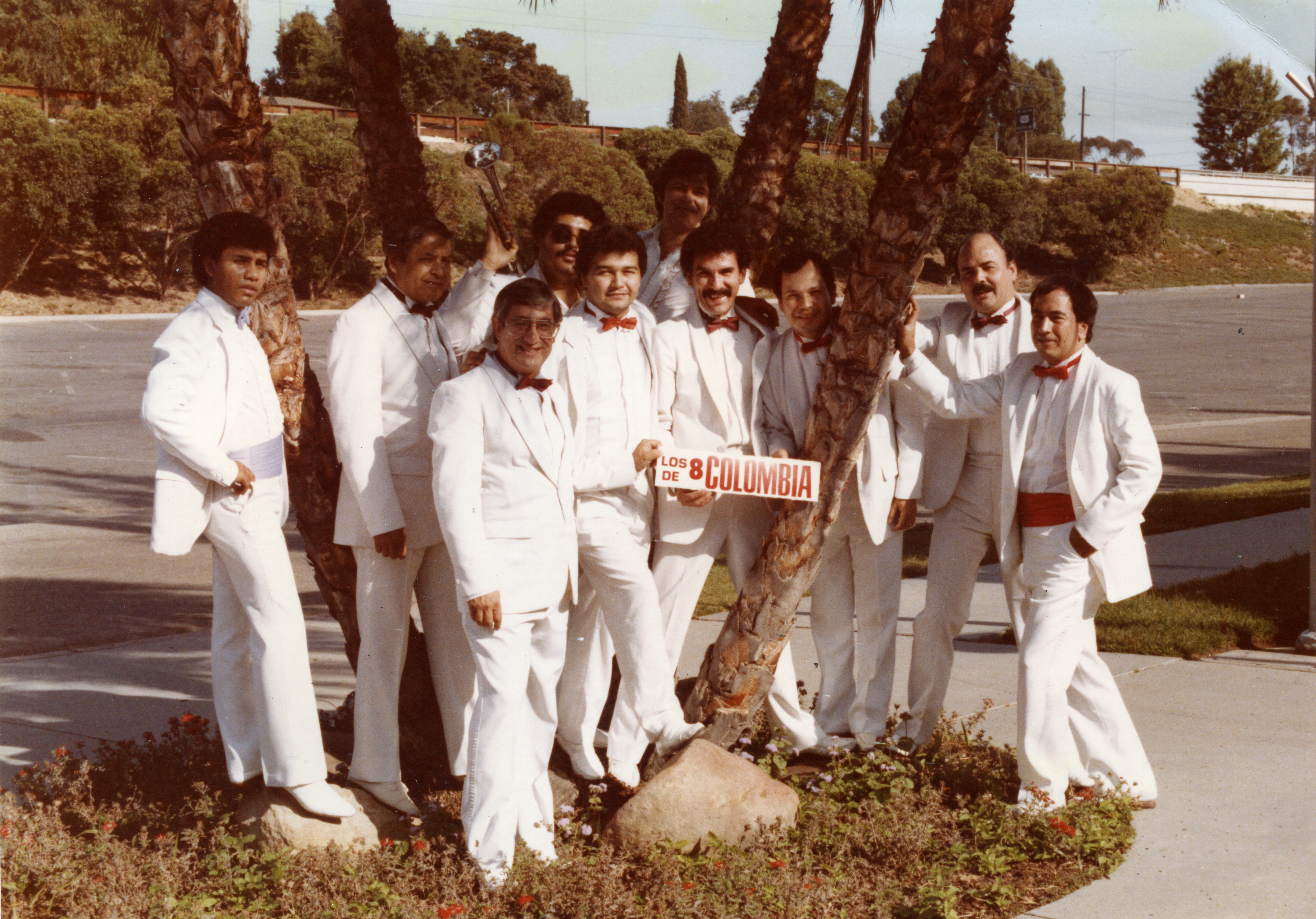 Orquesta Los Ocho de Colombia, vestidos de blanco posando para la cámara. Observamos a los integrantes con publicidad de la agrupación