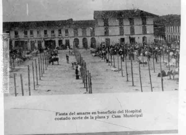 Reproducción fotográfica de la primera Fiesta del Amarre en beneficio del hospital. Costado norte de la plaza y casa municipal de Sevilla. C. 1955