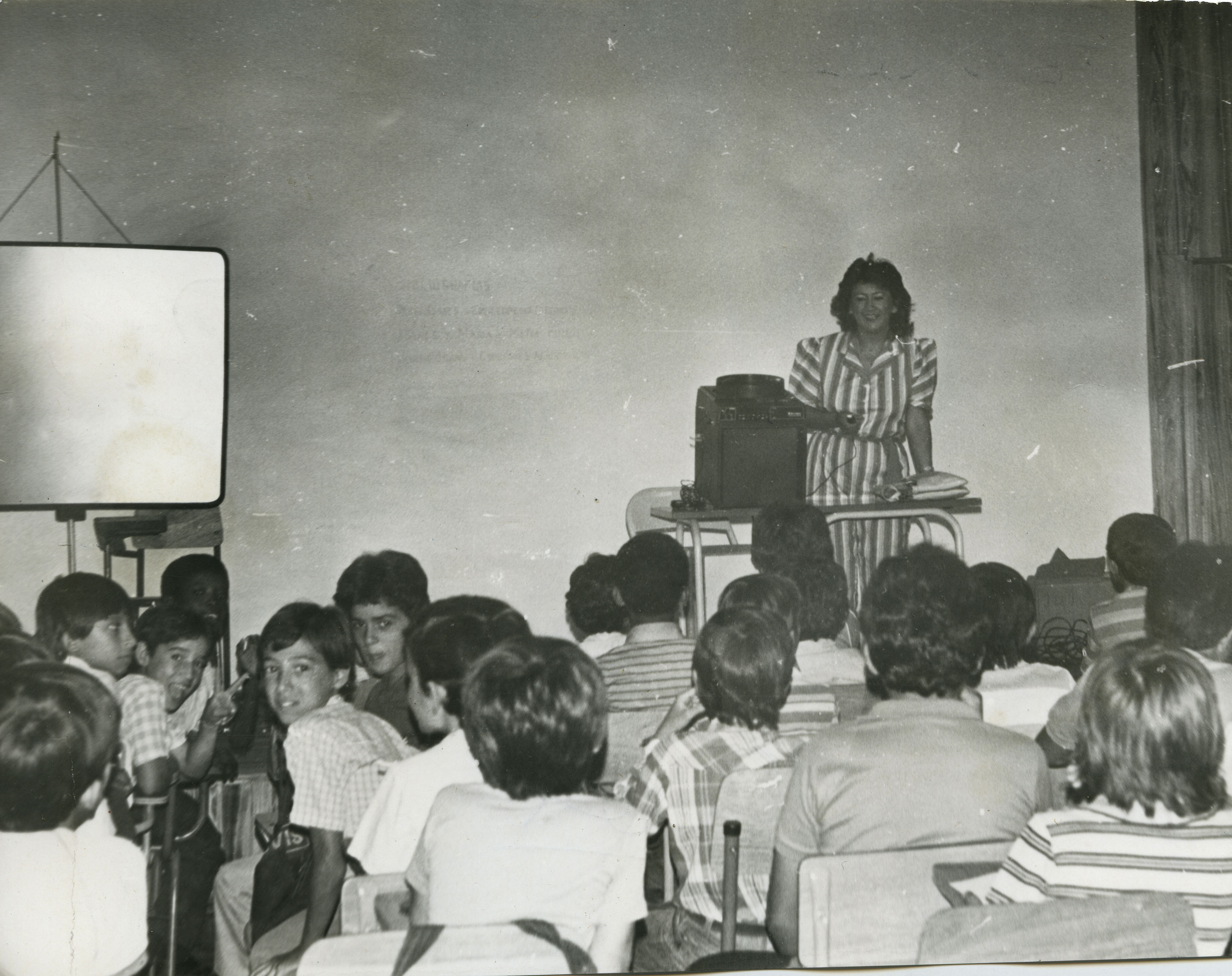 Diario Occidente (1984). Profesora en clases con alumnos del colegio Santa Librada. Cali. Santiago de Cali: Biblioteca Departamental Jorge Garcés Borrero.