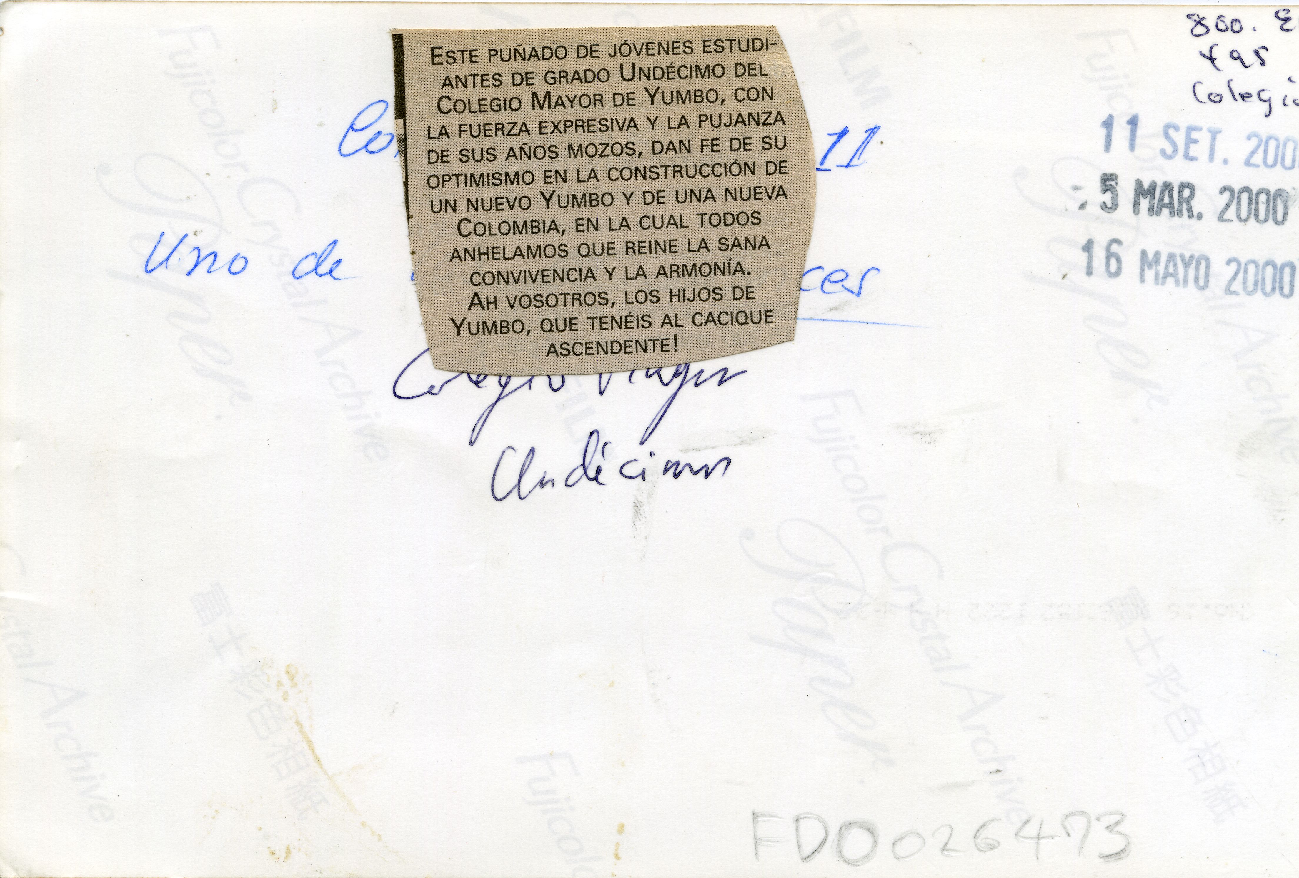 Al reverso de la fotografía se anexa recorte: Este puñado de jóvenes estudiantes del grado undécimo del colegio Mayor de Yumbo, con la fuerza expresiva y la pujanza de sus años mozos, dan fe de su optimismo en la construcción de un nuevo Yumbo y de una nueva Colombia, en la cual todos anhelamos que reine la sana convivencia y la armonía. Ah vosotros, los hijos de Yumbo, que tenéis al cacique ascendente.