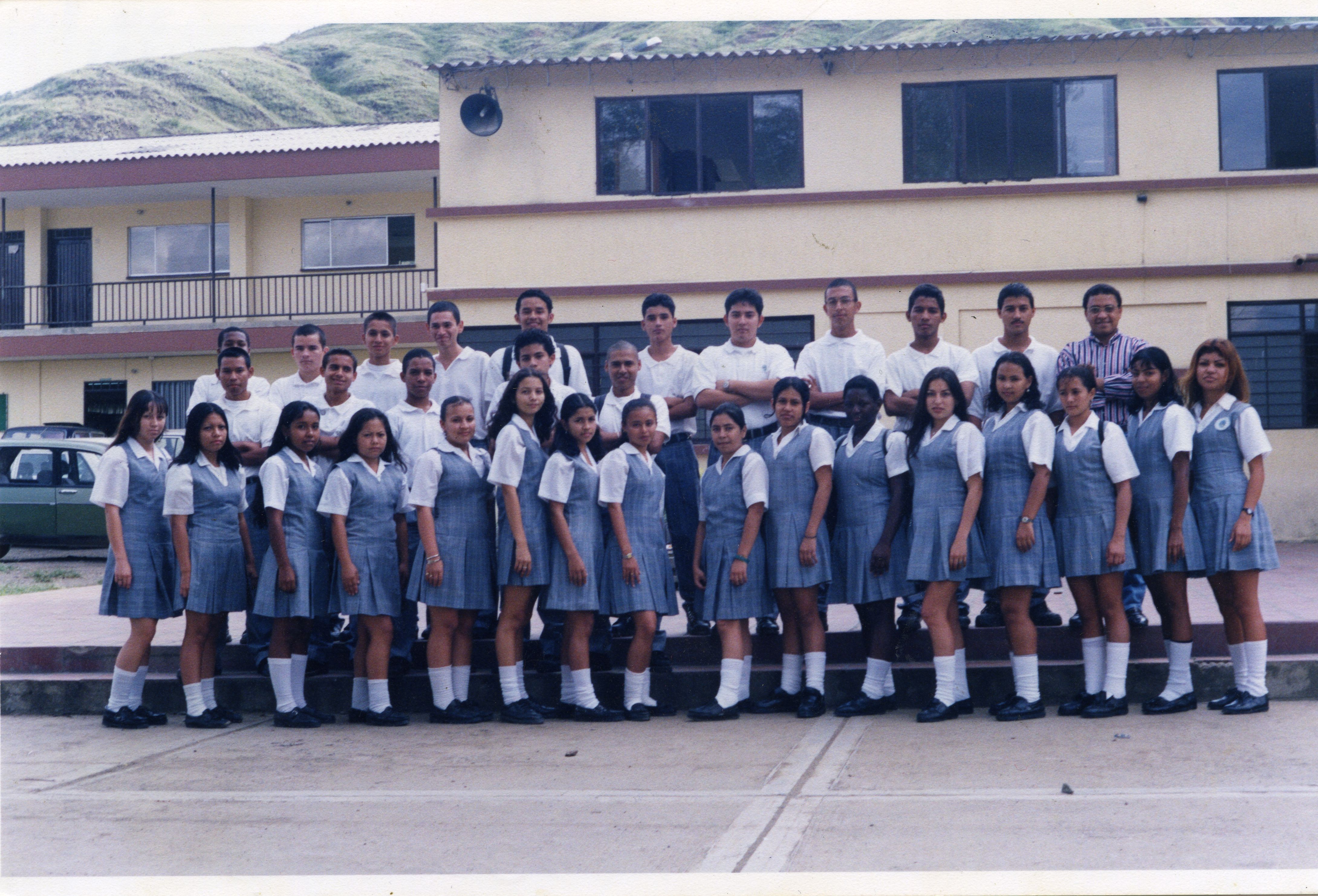 Fotografía de plano completo, donde se observan a jóvenes, hombres y mujeres posando para la foto, podemos ver que las mujeres tienen un uniforme compuesto por una jardinera de color azul cielo y camisa blanca por debajo, mientras los hombre s tienen puesto pantalón azul y camisa blanca, también observamos con los muchachos a una persona adulta