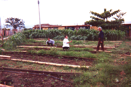 Imagen tomada en exterior, donde se aprecia algunos sembrados organizados en eras, demarcadas con estacas. Se observan algunas personas trabajando. Al fondo algunas viviendas. Plano general.