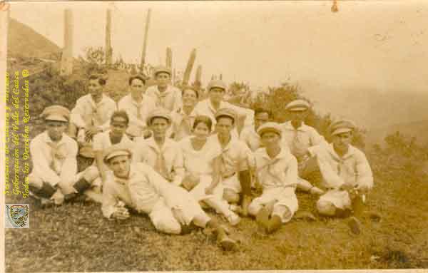 Descanso en la competencia y pose para la fotografía que muestra el traje de los ciclistas en la época. 1927