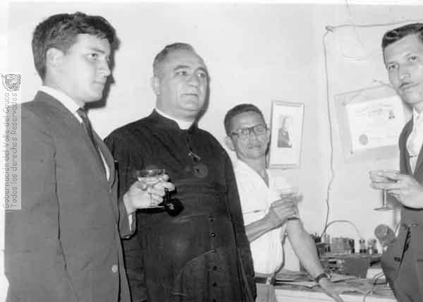 departen una copa de vino: Hernán Barona Sos, Manuel José Ramírez (Sacerdote), Lucindo Ospitia, Emilio Torres. Pradera, 1962.