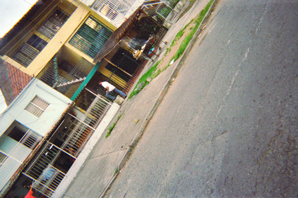 Pérez Paredes, O. F. (2005). En la imagen se aprecia en el extremo inferior una vía pavimentada y sobre ella al fondo la fachada de varias viviendas de dos y tres plantas. Santiago de Cali: Biblioteca Departamental Jorge Garces Borrero.