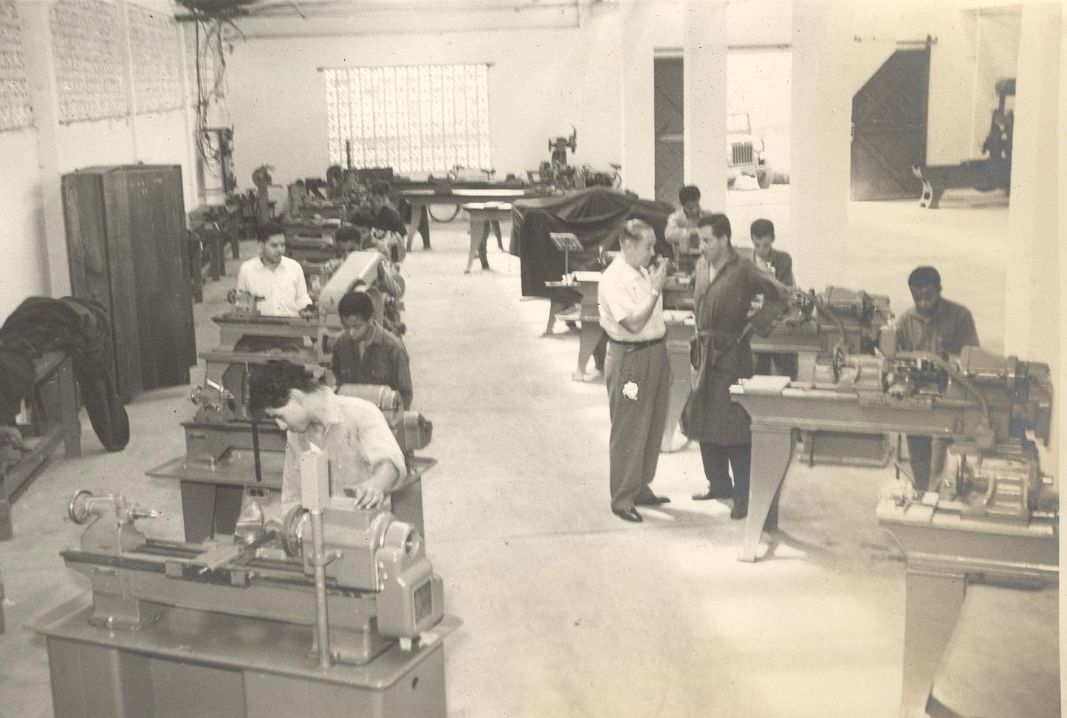Estudiantes en el taller de mecánica industrial del Instituto Antonio José Camacho. Actualmente se conoce como Instituto Educativo Técnico Industrial Antonio José Camacho. Santiago de Cali, fecha aproximada, 1960.
