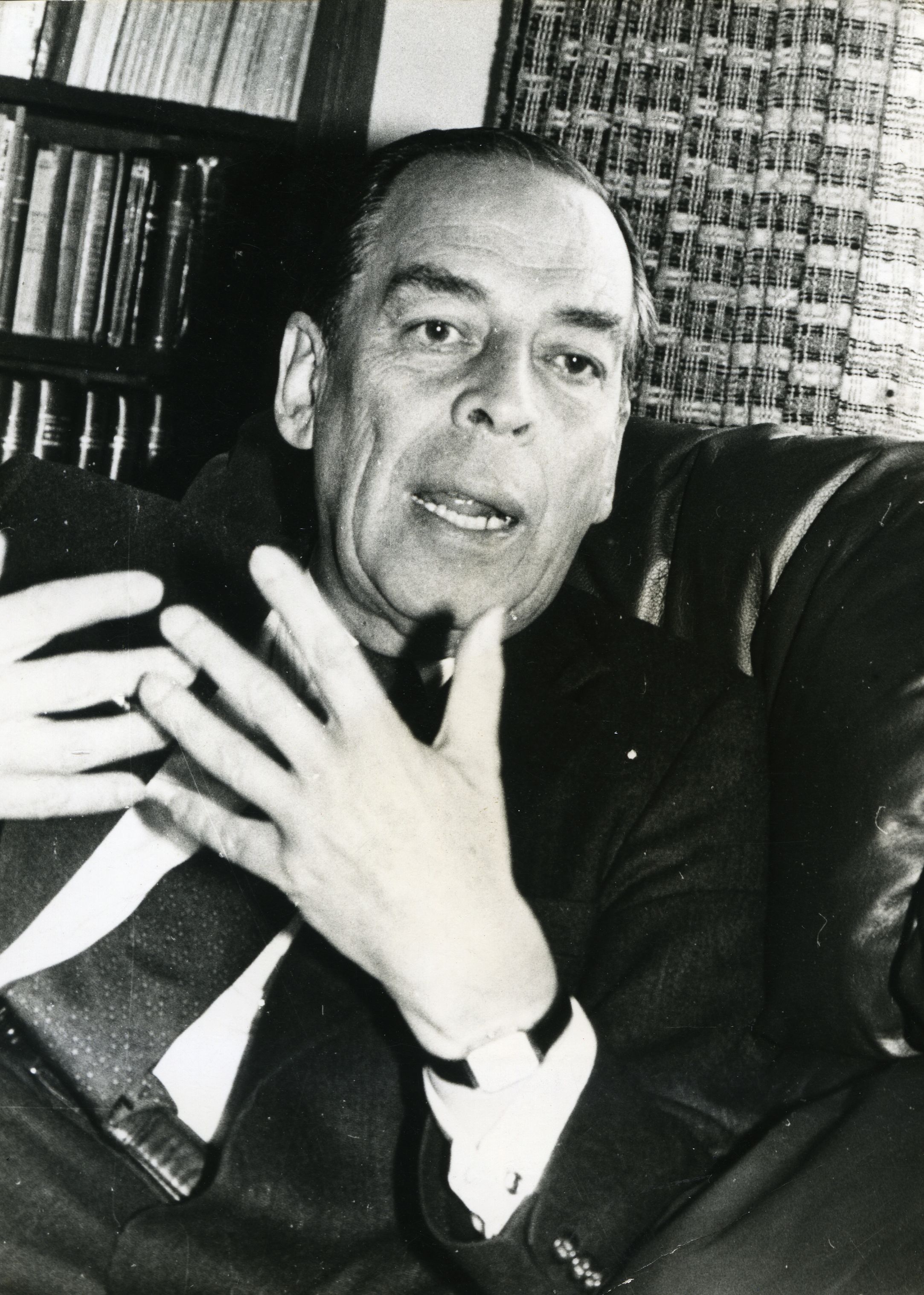 Álvaro Gómez Hurtado, abogado, político, escritor y periodista colombiano. Como político ocupó los cargos de Concejal de la ciudad de Bogotá, Representante a la Cámara, Senador de la República, Ministro Plenipotenciario, delegado en diferentes ocasiones a conferencias internacionales, Embajador ante las Naciones Unidas, Embajador en Suiza, Italia, Estados Unidos y Francia. Fue candidato a la presidencia en los periodos 1974, 1986,1990. En la gráfica entrevista con Álvaro Gómez Hurtado. Se aprecia muy elegante de corbata, camisa y traje
