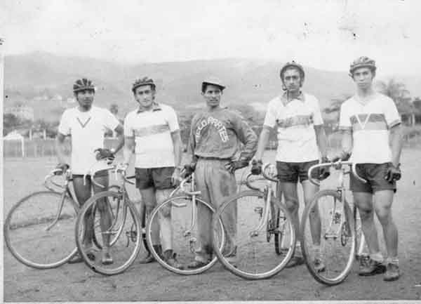 Oscar Oyola, ganador de la etapa Cali- Bogotá en el Circuito Nacional de ciclismo. le acompaña Argemiro Sánchez y otros compañeros. Santiago de Cali. 1948.