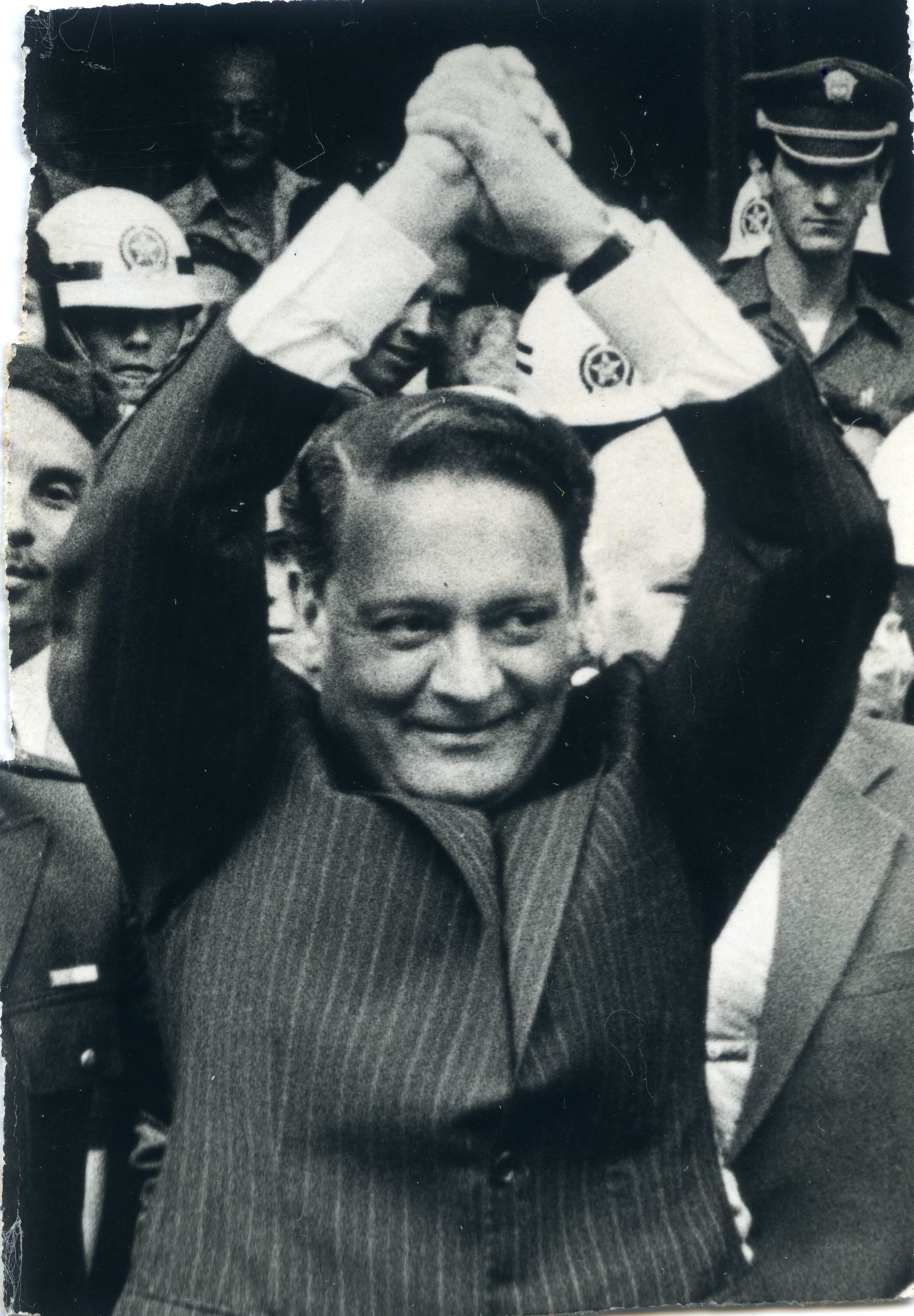 Fotografía de Humberto González Narváez, donde se aprecia de frente con las manos juntas hacia arriba y sonriente, en la parte de atrás se ven varias personas uniformadas, y personas del común.
