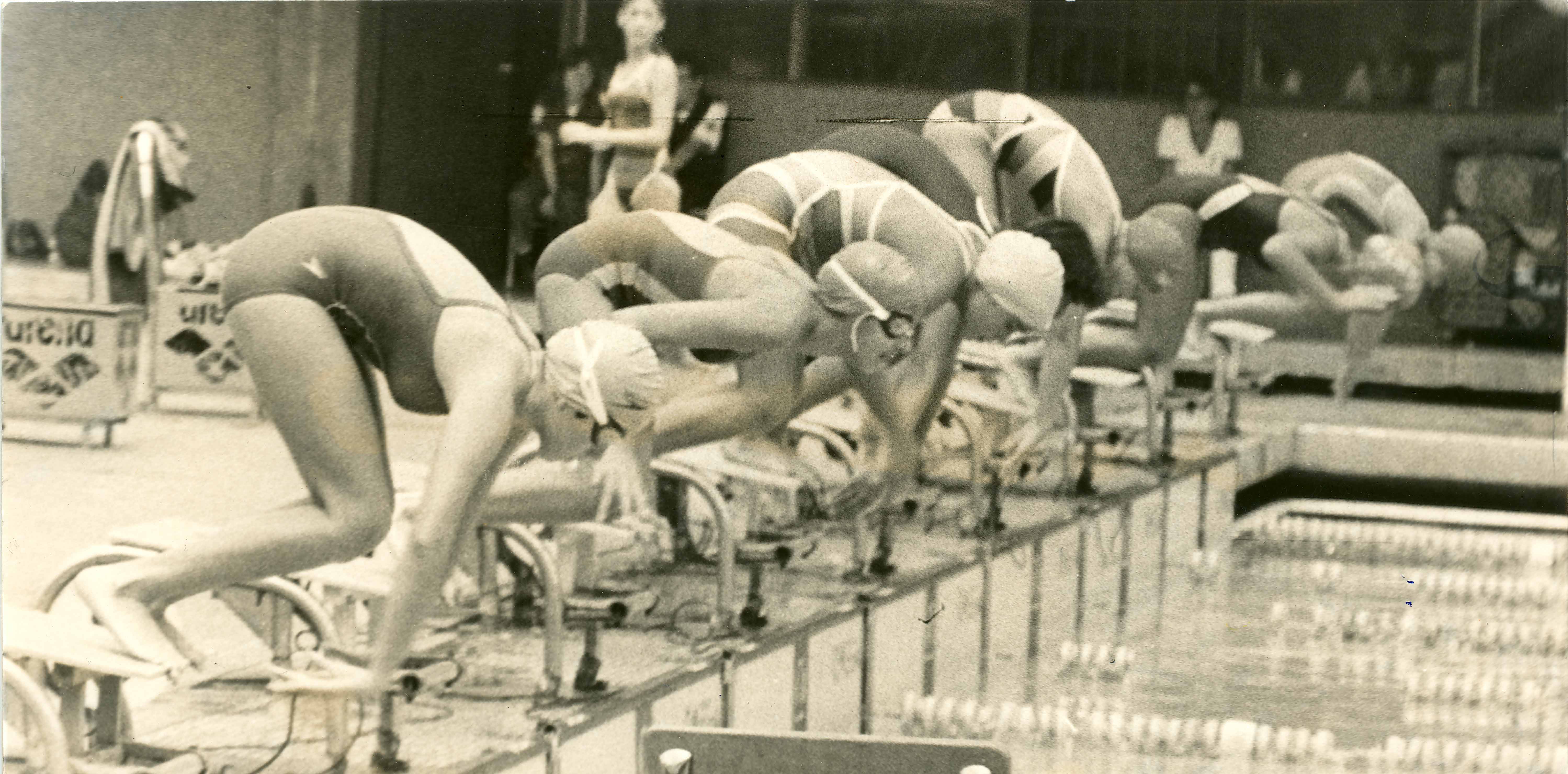 Romero, J. & Diario Occidente (1985). Partida de los 100 metros mariposa en el Torneo Internacional de Natación Ciudad de Cali. Santiago de Cali: Biblioteca Departamental Jorge Garcés Borrero.