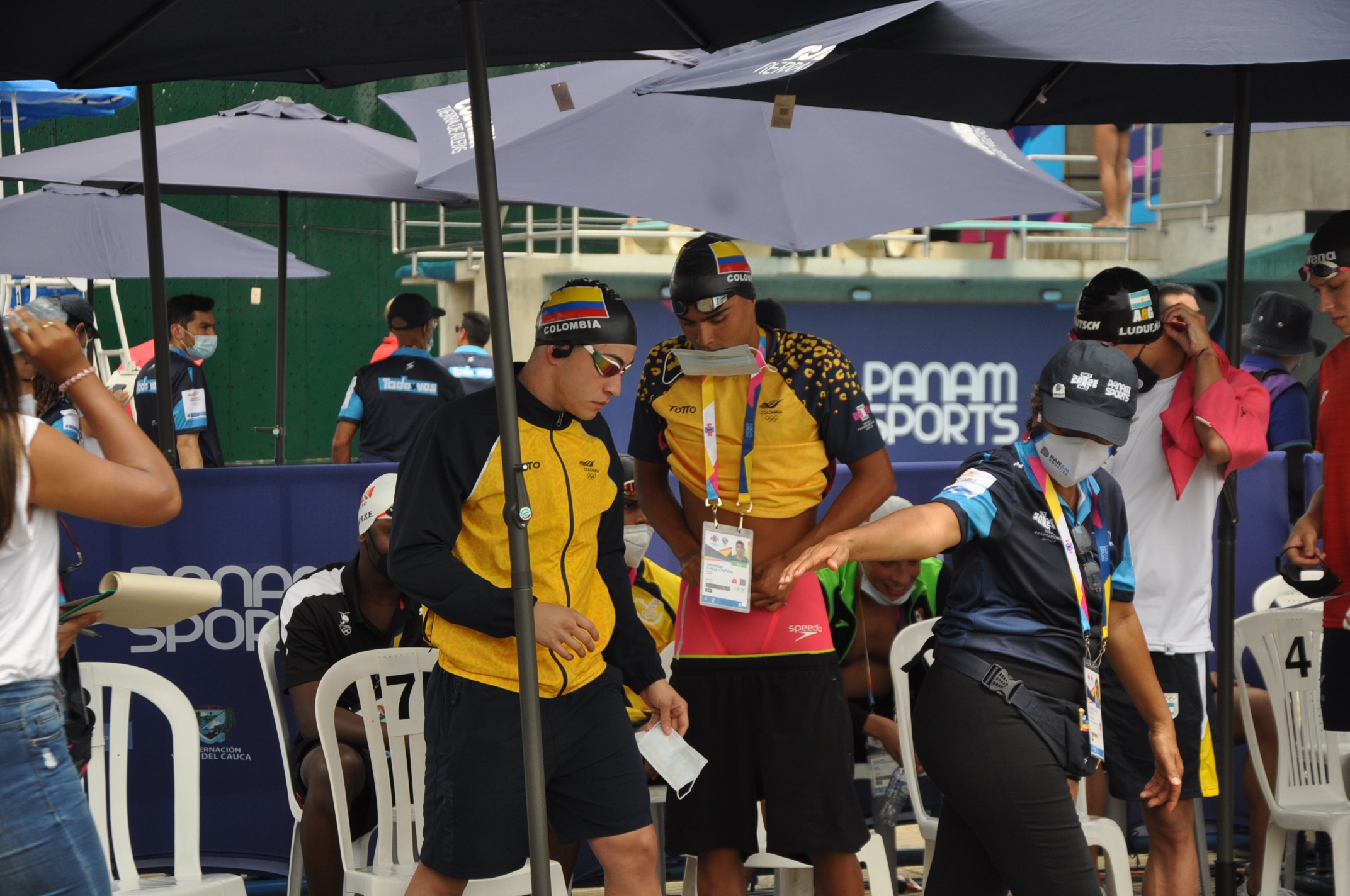 En la fotografía podemos observar a dos de los deportistas colombianos que participaron en la competencia de natación en los "I Juegos Panamericanos Junior", que se llevaron a cabo en la ciudad de Cali.