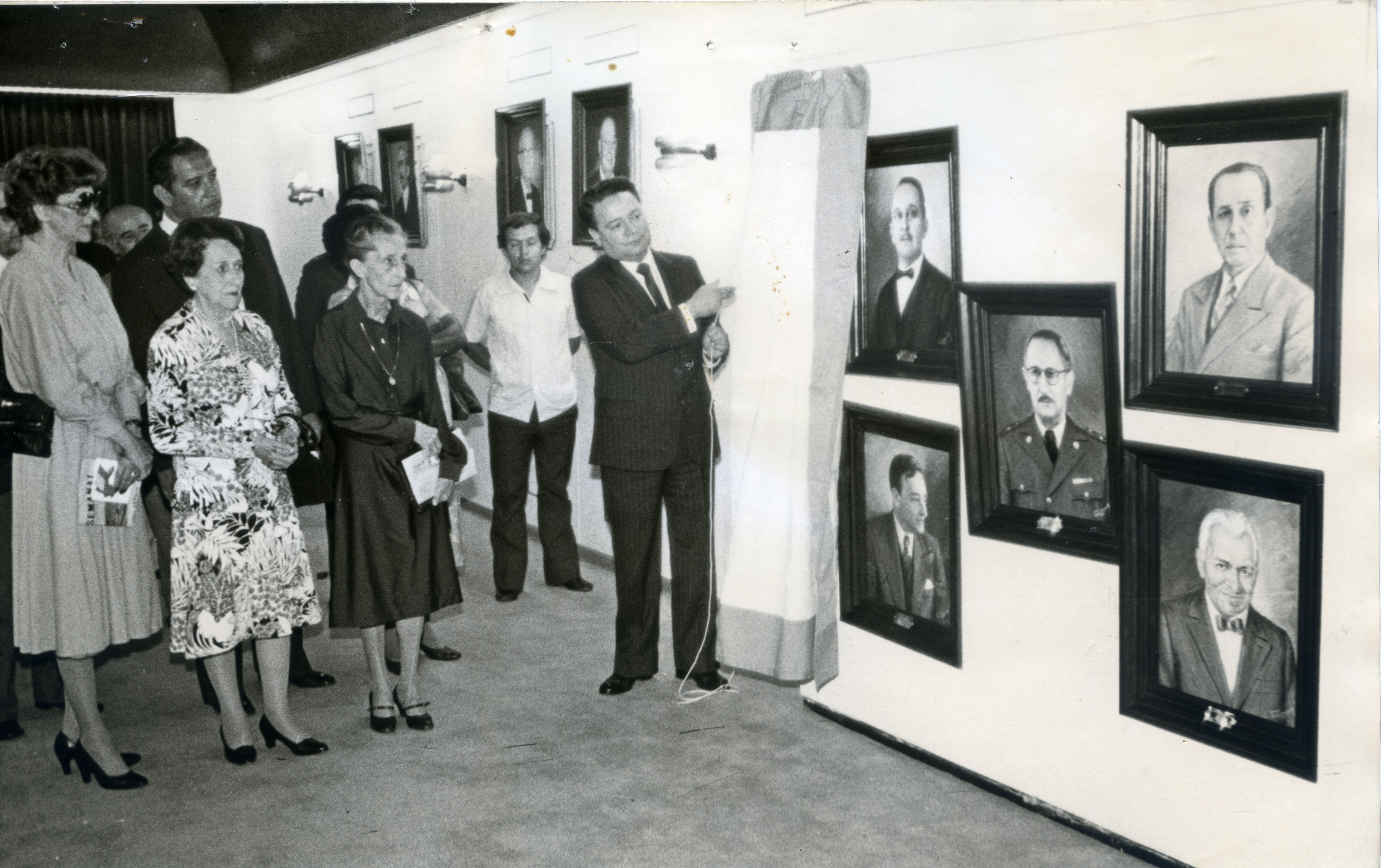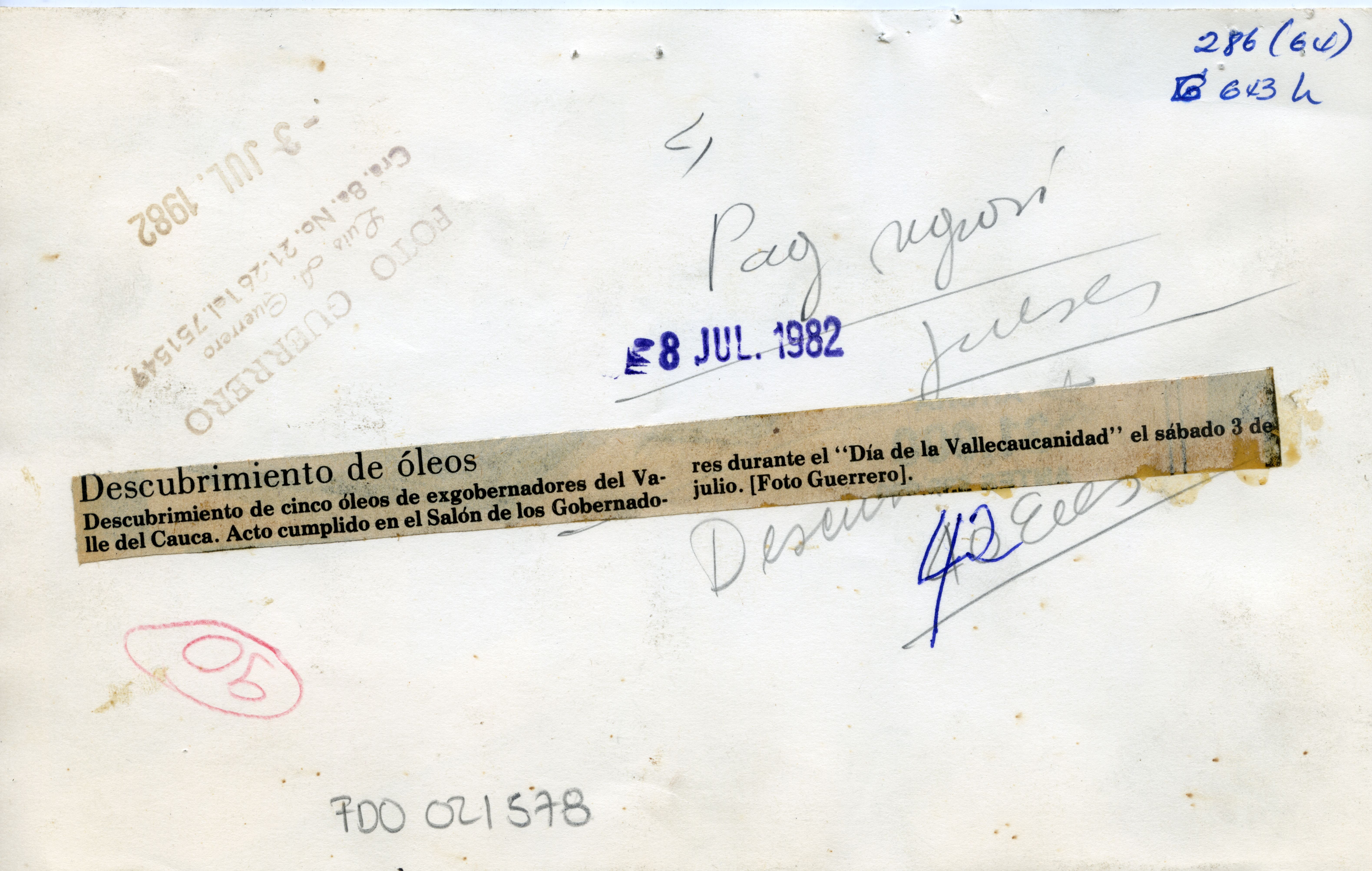 Humberto González Narváez realiza descubrimiento de cinco óleos de exgobernadores del Valle del Cauca. Acto cumplido en el salón de los gobernadores el "Día de la Vallecaucanidad" el sábado 3 de julio. (Foto Guerrero).
