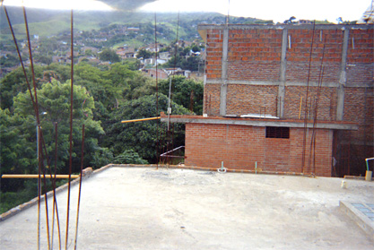 Plano general. Imagen del sector rural desde la loza de concreto. En primer plano varillas utilizadas en las mejoras. En el plano medio edificación de varios pisos con terminación en ladrillo.