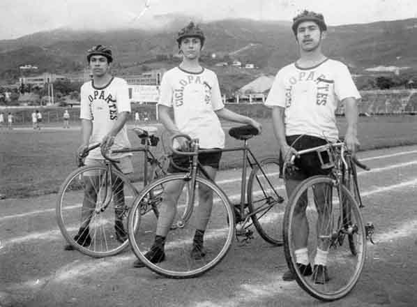 Argemiro Sánchez y amigos. Se observa al fondo el Hospital Departamental. Santiago de Cali, 1950.