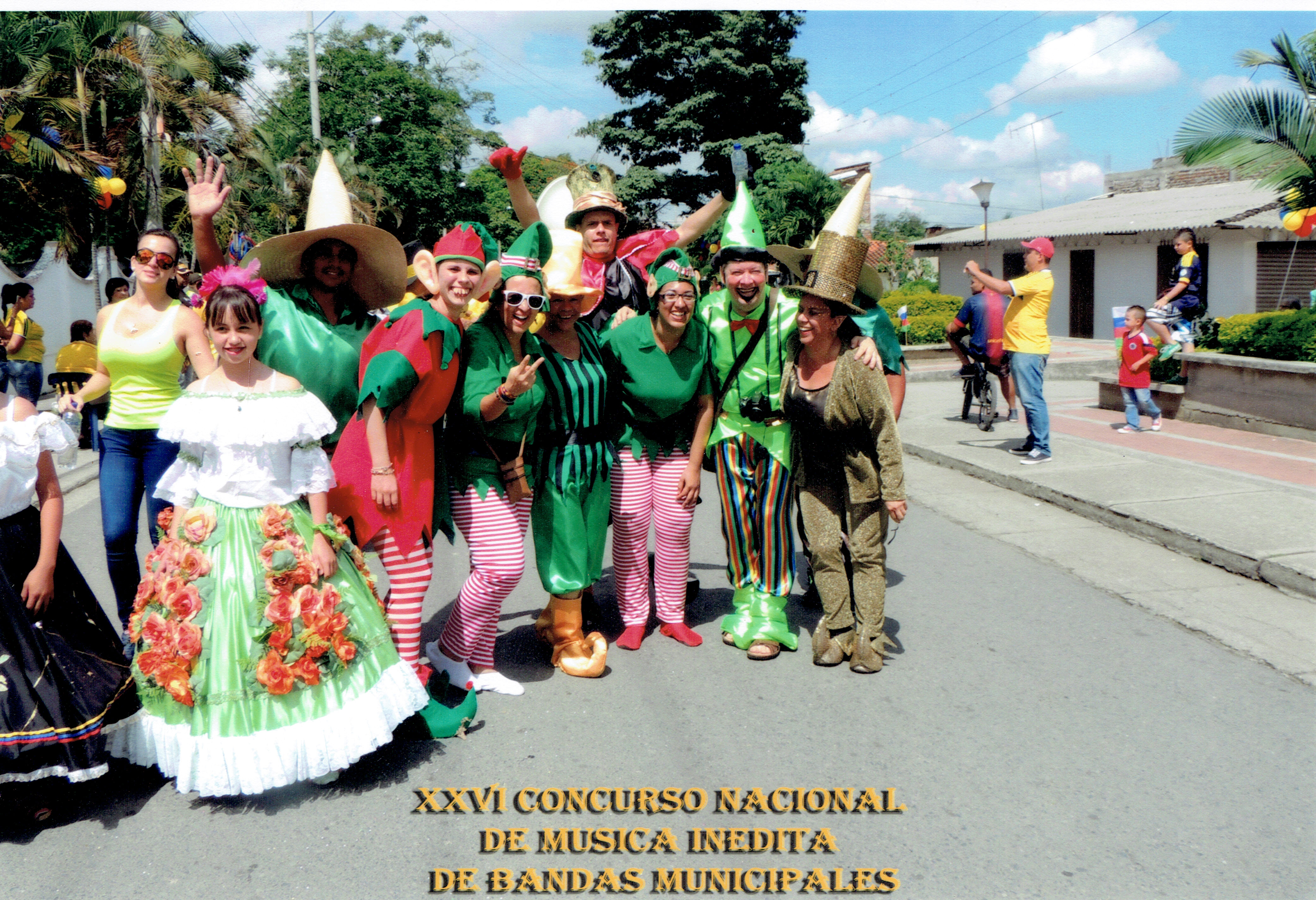 Banda Santa Cecilia. Comparsa de Duendes presentada en el desfile inaugural del concurso nacional de bandas de música inédita, banda mayores. Luisa María Lopeda, Juan Erazmo, Claudia Marcela Tascón Nerieth García, Luz Angela Lizalda, Disney, Karen, Edgar Orlando Ospina, Edna Victoria Peñaranda