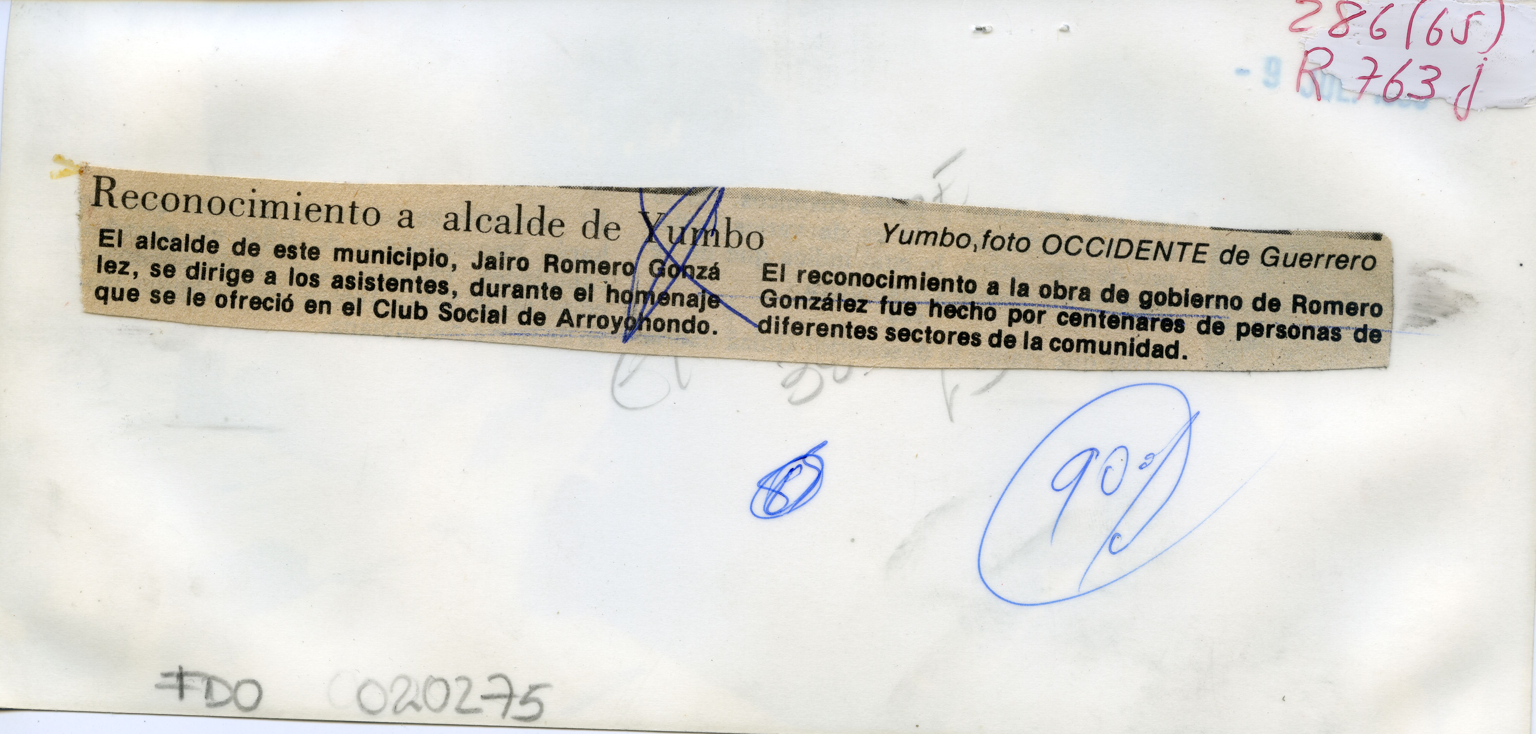 En la fotografía podemos observar al alcalde de Yumbo, Jairo Romero González participando de un evento de reconocimiento que sus seguidores organizaron para resaltar su buena gestión para con el municipio de Yumbo. Al reverso de la fotografía se anexa recorte: "Reconocimiento a alcalde de Yumbo. El alcalde de este municipio, Jairo Romero González, se dirige a los asistentes, durante el homenaje que se le ofreció en el Club Social de Arroyohondo. El reconocimiento a la obra de gobierno de Romero González fue hecho por centenares de personas de diferentes sectores de la comunidad."