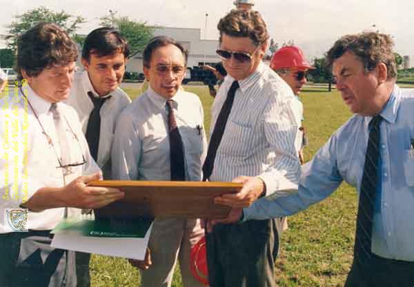 Alan Smurfit, Bernardo Guzmán, Victor Giraldo, MIchael Smurfit y Gustavo Gómez, en las instalaciones de la Planta Cartón de Colombia. Yumbo, C. 1992