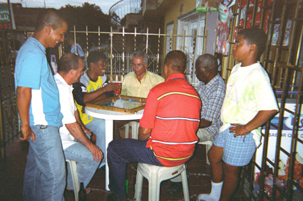 Plano Medio.  Se destaca un grupo de hombres sentados en una mesa jugando parques, a la entrada de una tienda.  Al fondo a través de una reja color café se alcanza a ver la fachada de algunas viviendas.