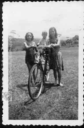 Rosmira Londoño y Carolina Villegas, montando en bicicleta al niño Orlando Villegas, el día que fueron de paseo al río Meléndez. Cali. 1947.