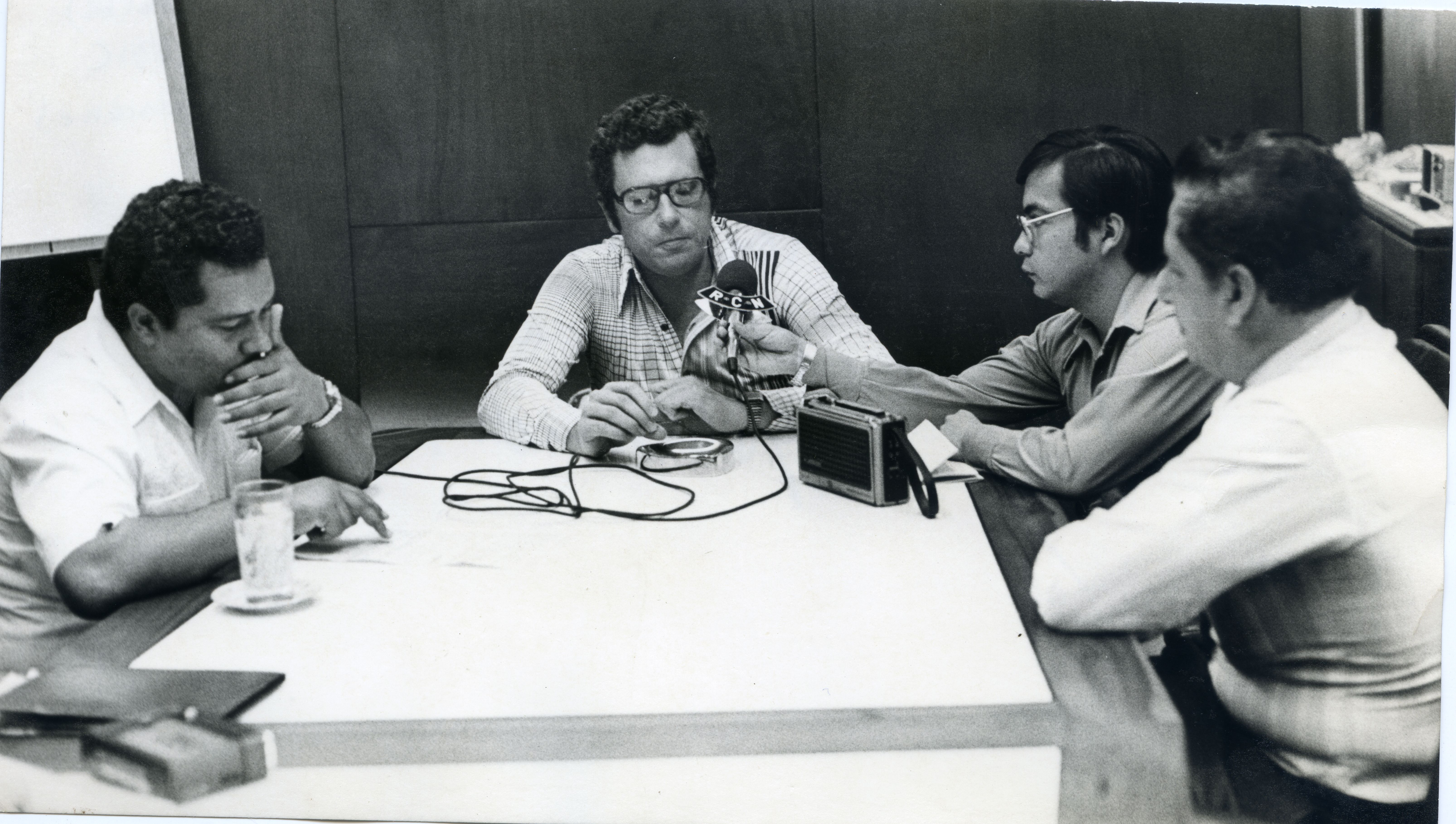 Foto de plano medio largo de Carlos Holguin Sardi donde se puede apreciar de frente y sentado, tiene camisa de manga larga, tiene anteojos, junto a él se encuentran tres personas más, de las cuales una de ellas le tiene sostenido con su mano derecha un microfono.