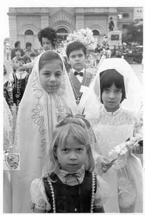 Adriana Arce y Magdalena Vaca en su primera comunión, celebrada en la iglesia San Nicolás, las acompañó Claudia Urresta(centro). Cali. C. 1970.