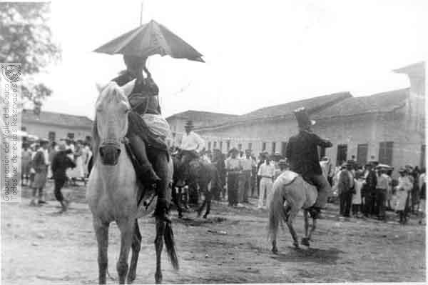 Presentación de eventos en el parque principal. Comparsa "La familia Castañeda" en la Primera Feria del Dulce de Pradera. 1945.
