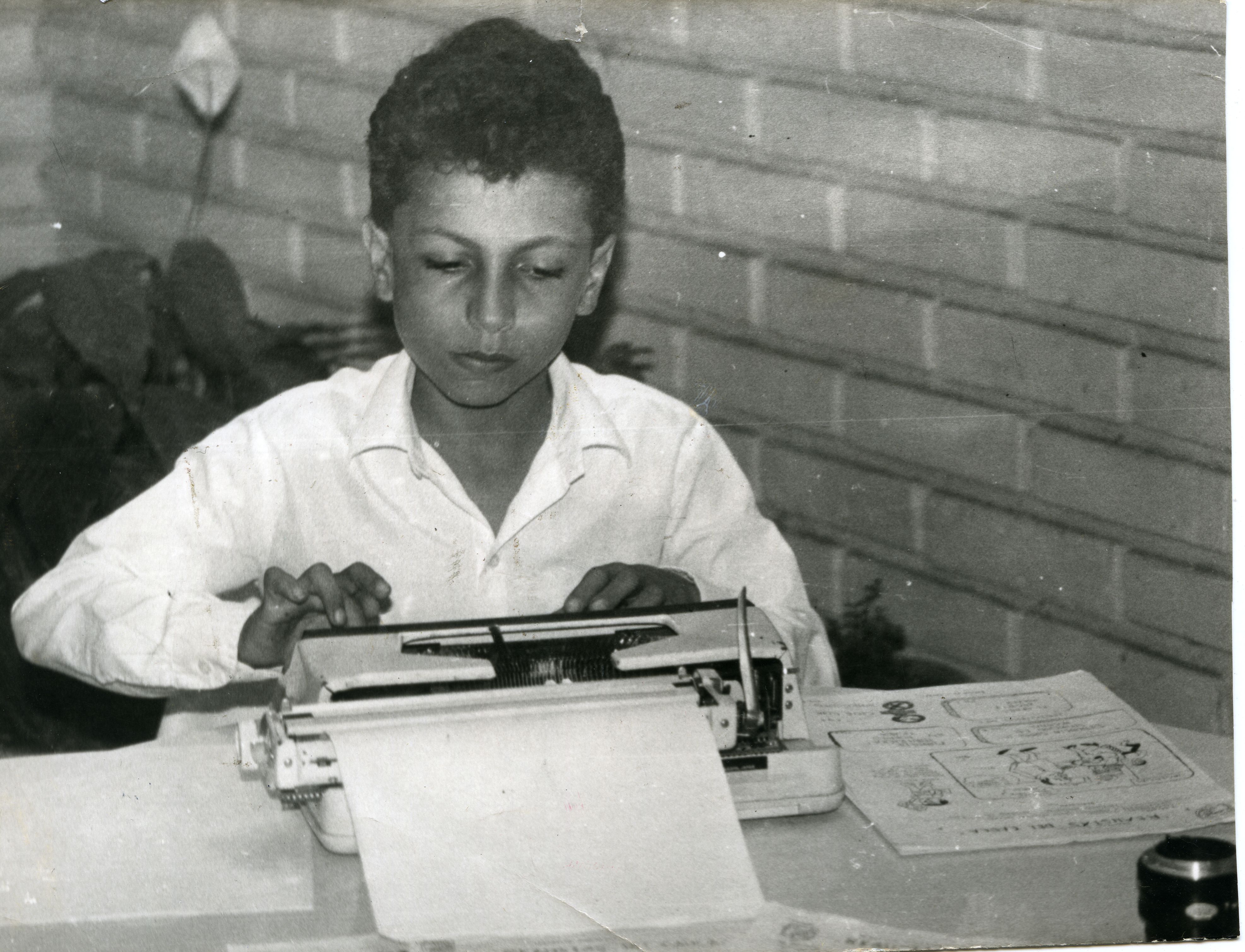 En la foto se ve a Diego, un niño que tipea concentrado en una maquina de escribir.