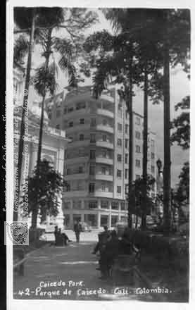 El paisaje urbano de Cali es una combinación de modernas edificaciones rodeadas de abundante vegetación. C. 1974.
