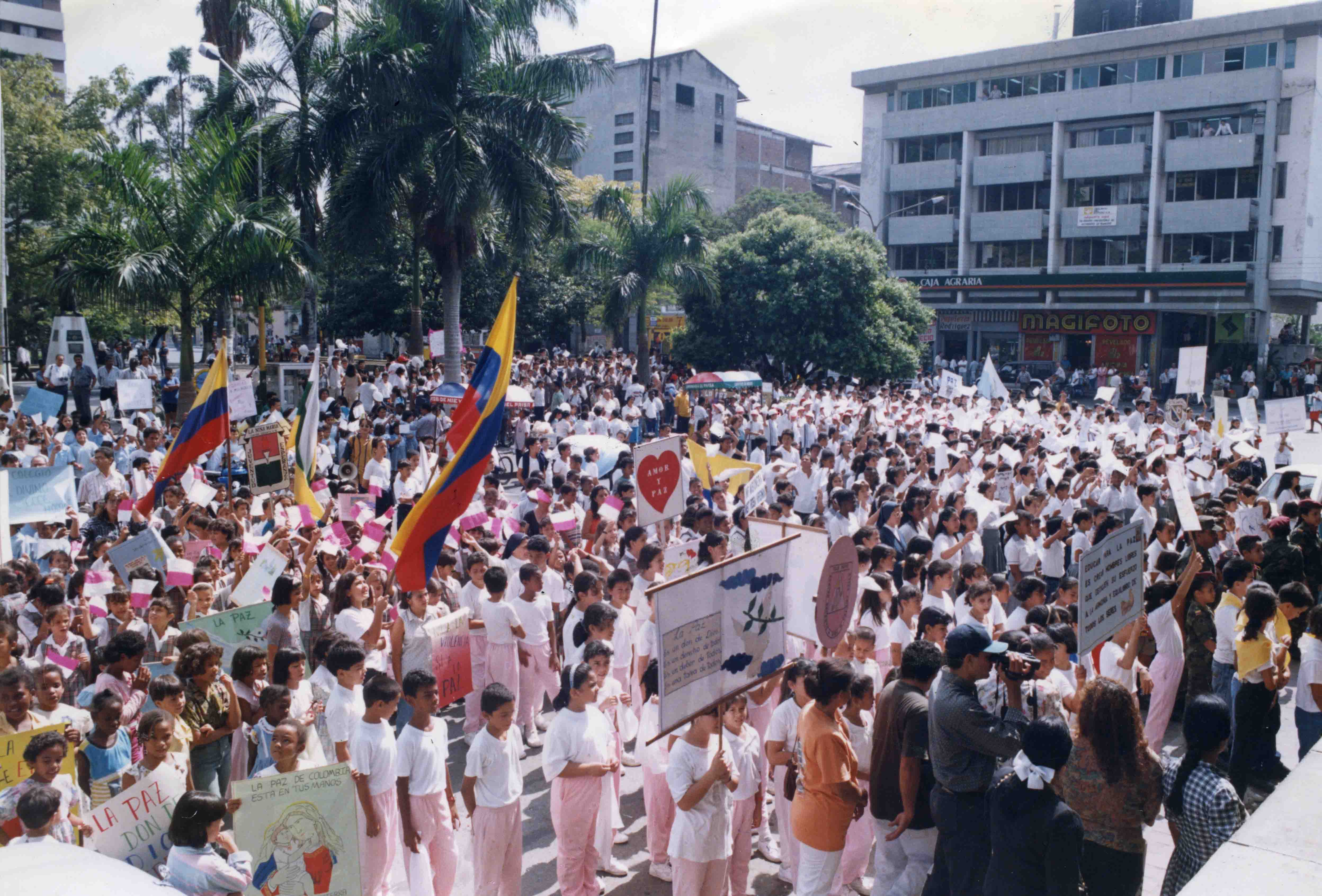 Marcha por la Paz, asistieron los planteles educativos y fue organizada por el Obispo de la Diósesis de Palmira >El Archivo del Patrimonio Fotográfico y Fílmico del Valle del Cauca es responsabilidad de la Biblioteca Departamental del Valle Jorge Garcés Borrero, por convenio de cooperación suscrito con la Secretaria del Cultura Departamental, con el fin de aunar esfuerzos para su conservación, preservación y divulgación del Archivo entre la comunidad Vallecaucana, especialmente entre los estudiantes e investigadores que visitan la Biblioteca, propiciando el su uso y consulta permanente. La universidad Icesi es un colaborador en el proceso de difusión, facilitando la tecnología que permite la consulta de las imágenes.