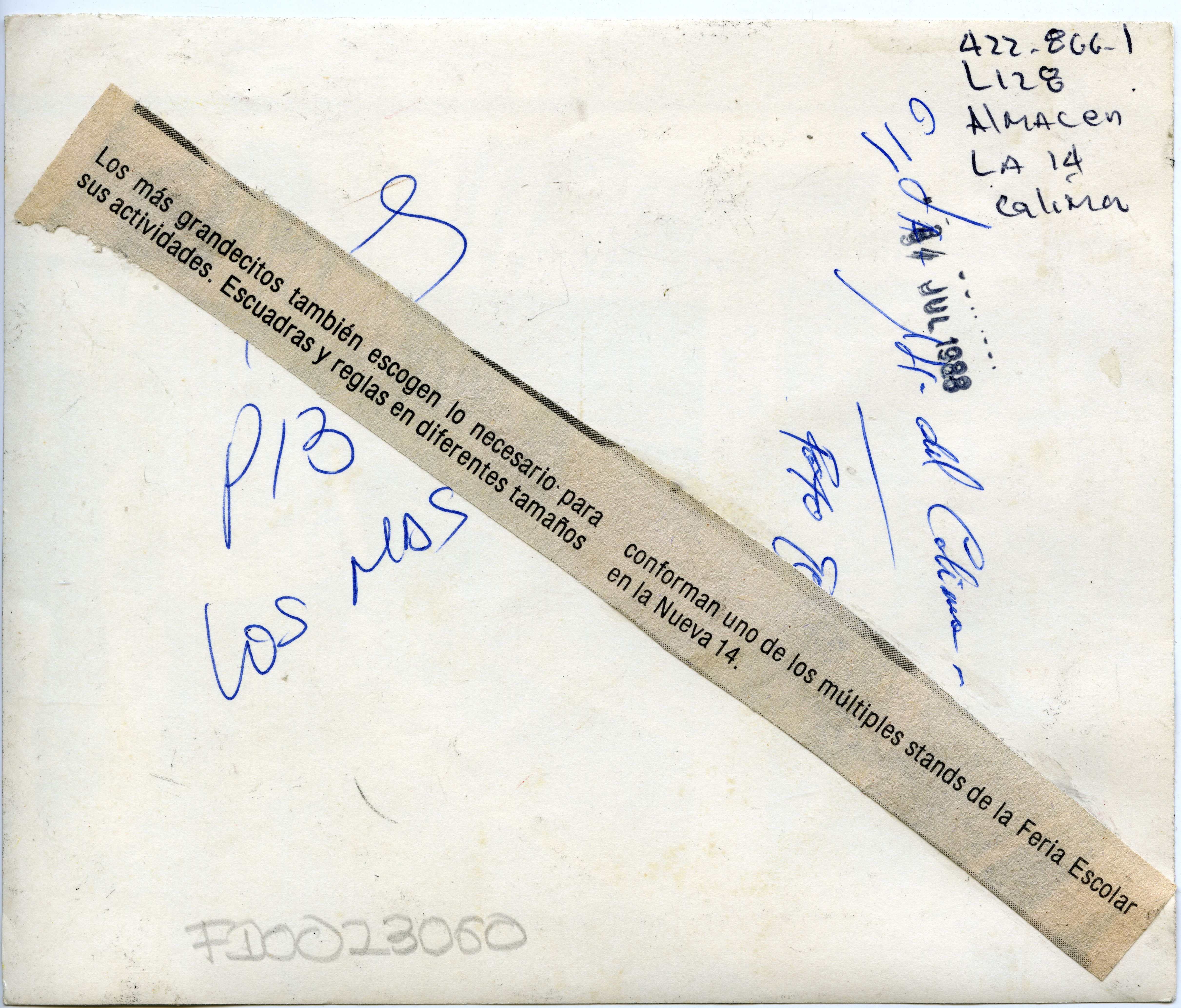 Al reverso de la fotografía se anexa recorte: Los más grandecitos también escogen lo necesario para sus actividades.Escuadras y reglas en diferentes tamaños conforman uno de los múltiples stands de la Feria Escolar de la Nueva 14