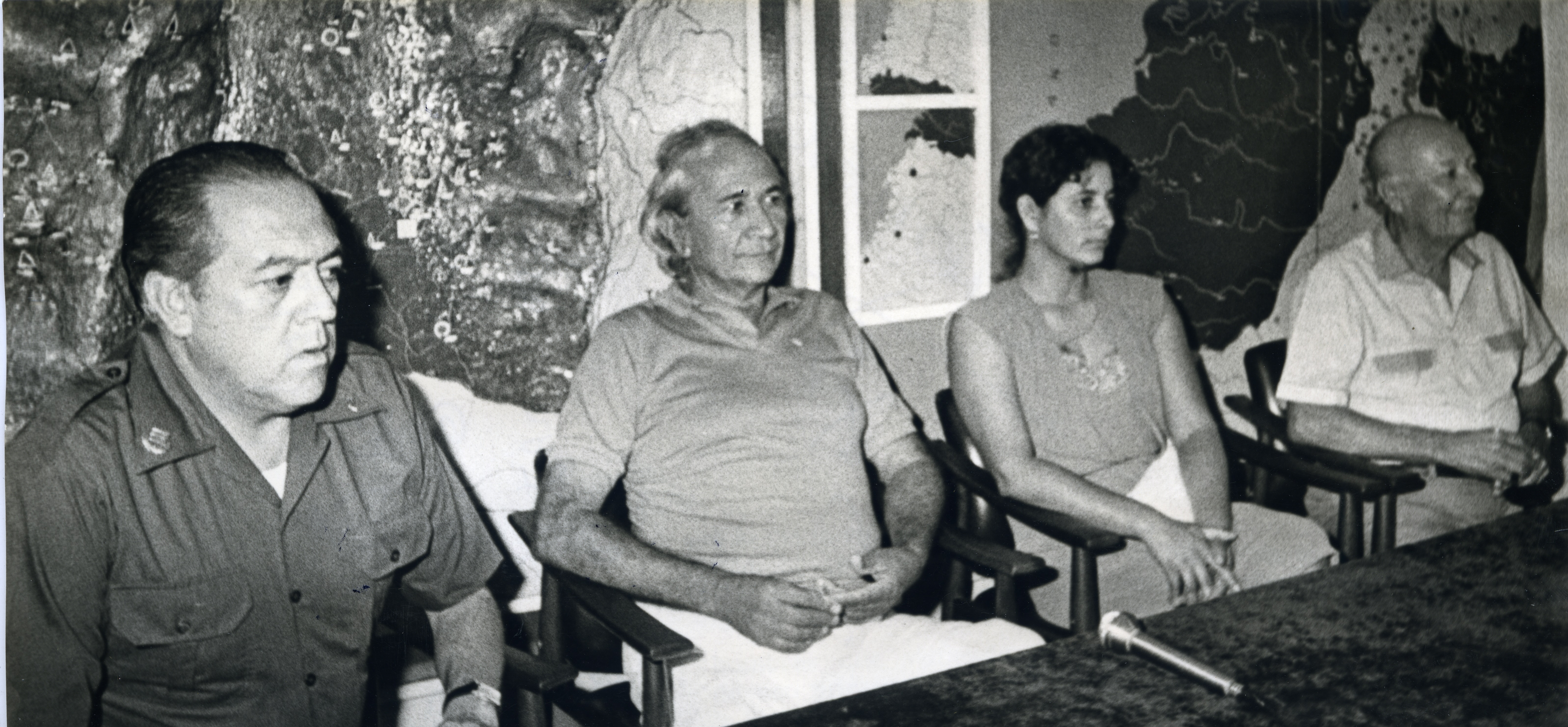 Industrial Luis Alfredo Grajales, Coronel Guillebardo Suárez, Ruby Alba Villamizar de Grajales y Gerardo Grajales. Al reverso de la fotografía se anexa recorte: Como nuevo, tras un sueño reparador y un buen baño, y acompañado de su esposa Ruby, de su hermano Gerardo y del coronel Guillebardo Suárez, comandante de la Policia Valle, se presentó ante la prensa, el industrial Luis Alfredo Grajales, secuestrado el pasado 30 de julio en zona rural de la Unión, y liberado el domingo anterior antes del medio