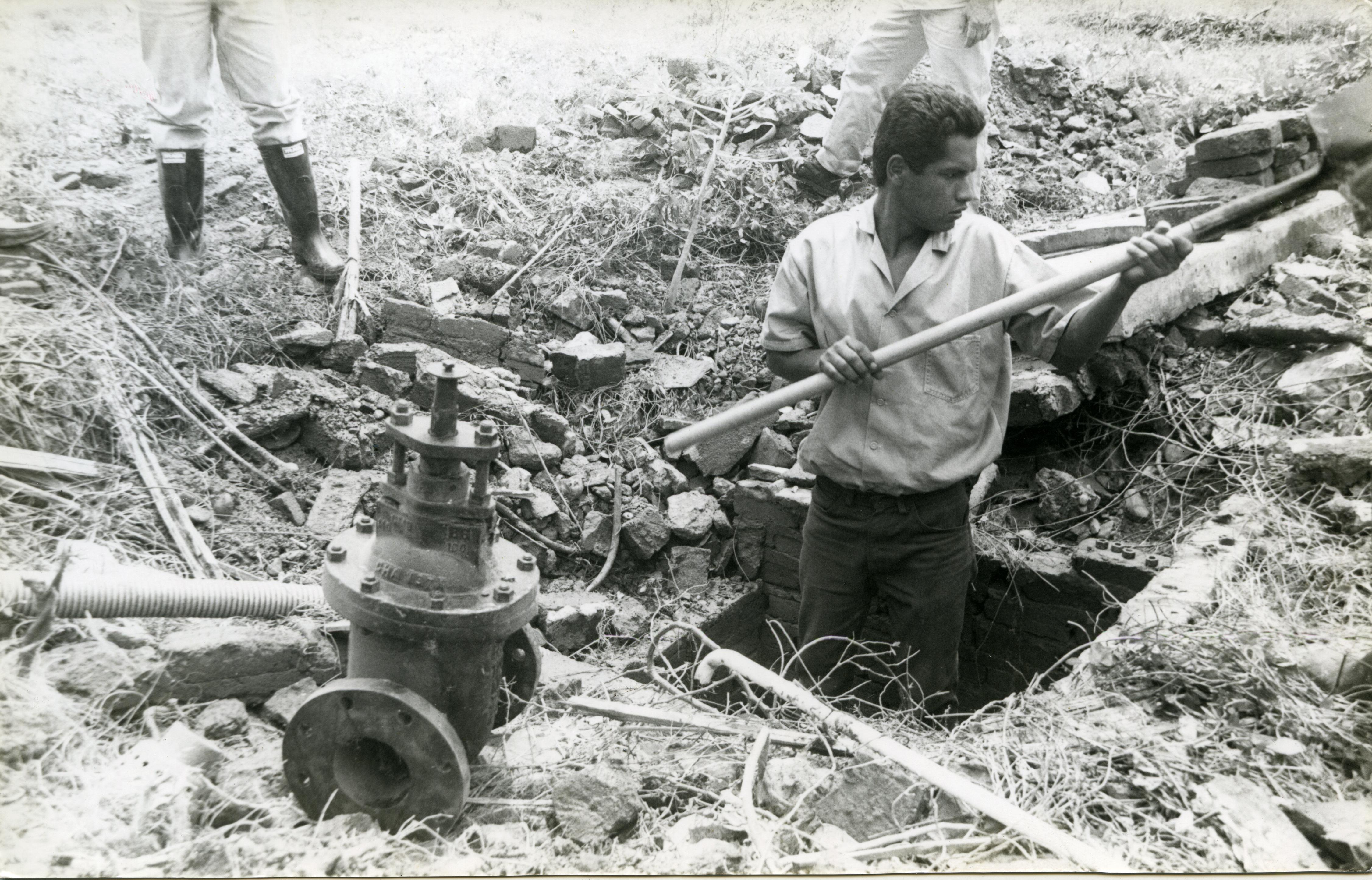 En la gráfica se observa la reparación de una ventosa del acueducto por parte de la empresa EMCALI. Se observa un trabajador utilizando una pala y un hidrante.