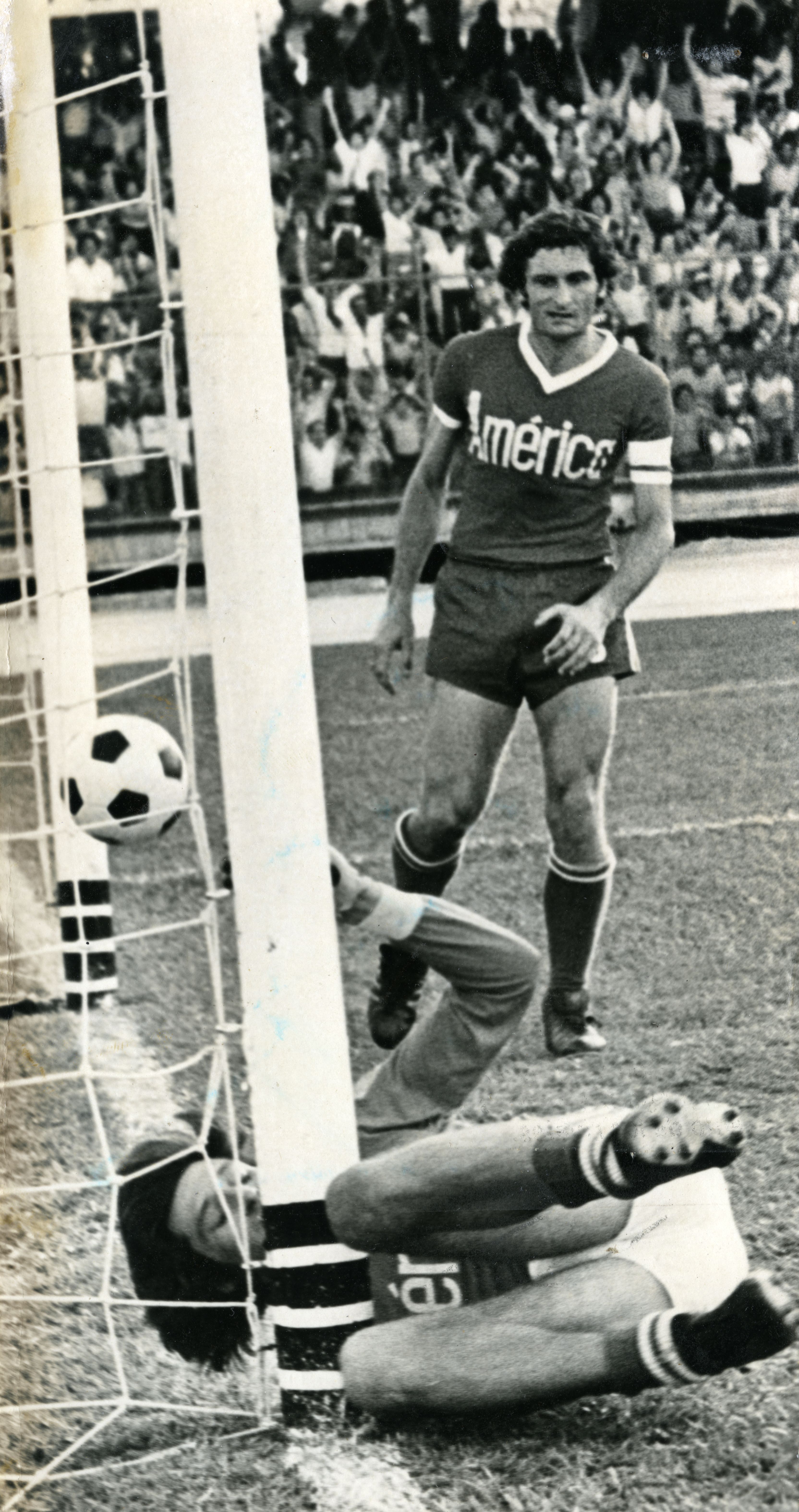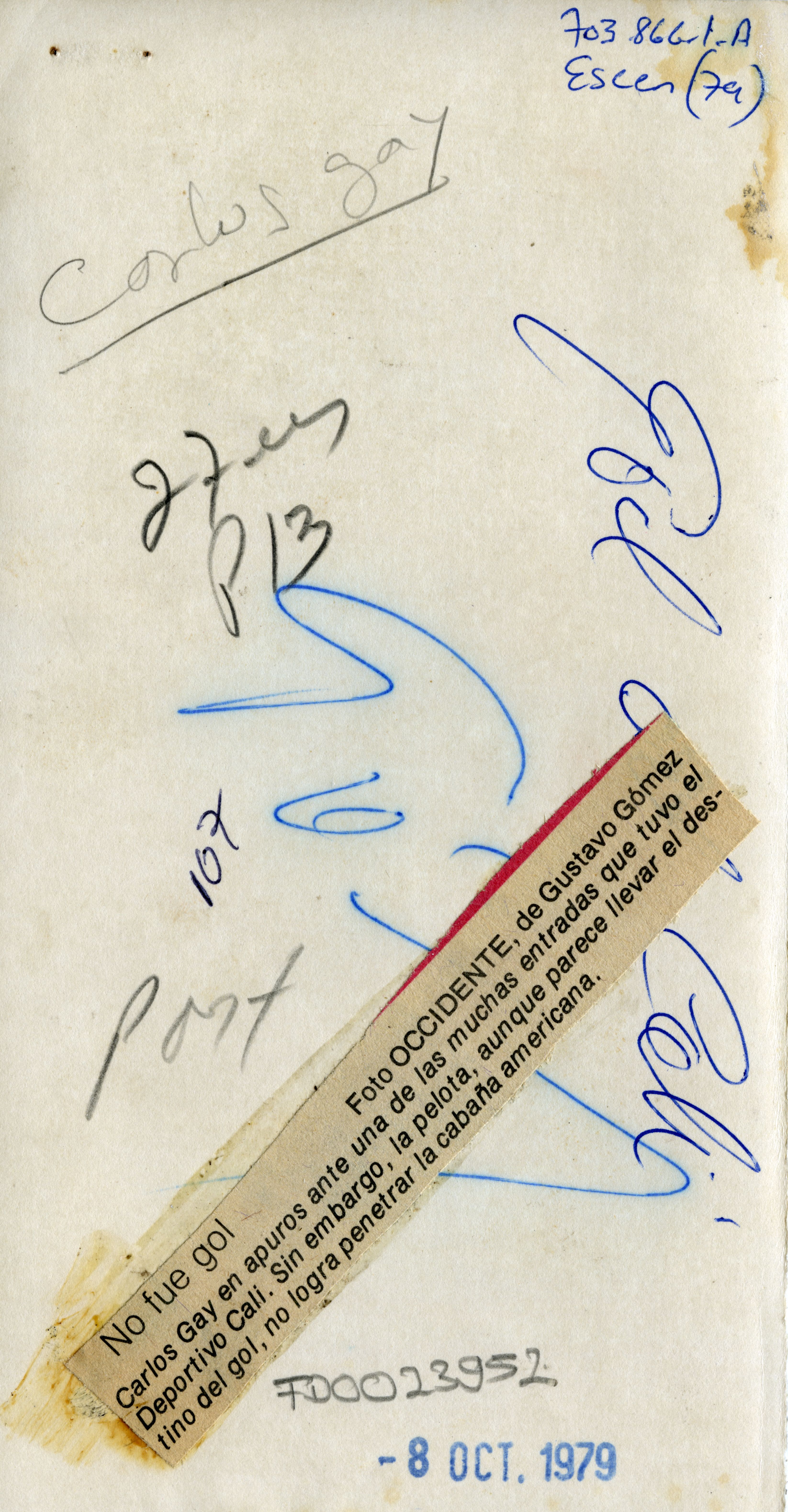 Carlos Gay en apuros ante una de las muchas entradas que tuvo el Deportivo Cali. Sin embargo, la pelota, aunque parece llevar el destino de gol, no logra penetrar la cabaña Americana. Se aprecia público en la tribuna