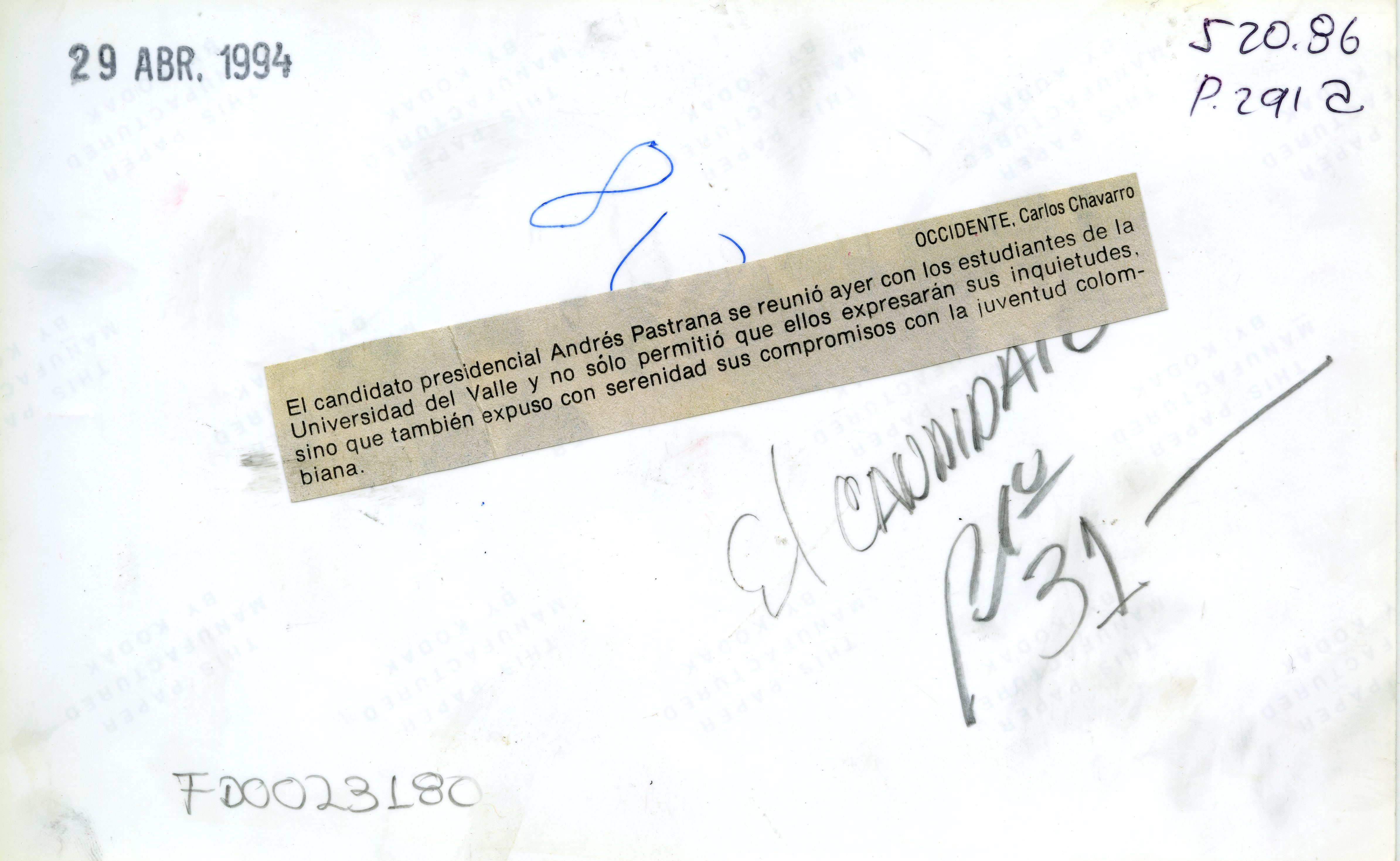 Al reverso de la fotografía se anexa recorte: "El candidato presidencial Andrés Pastrana se reunió ayer con los estudiantes de la Universidad del Valle y no sólo permitió que ellos expresarán sus inquietudes, sino que también expuso con serenidad sus compromisos con la juventud colombiana."