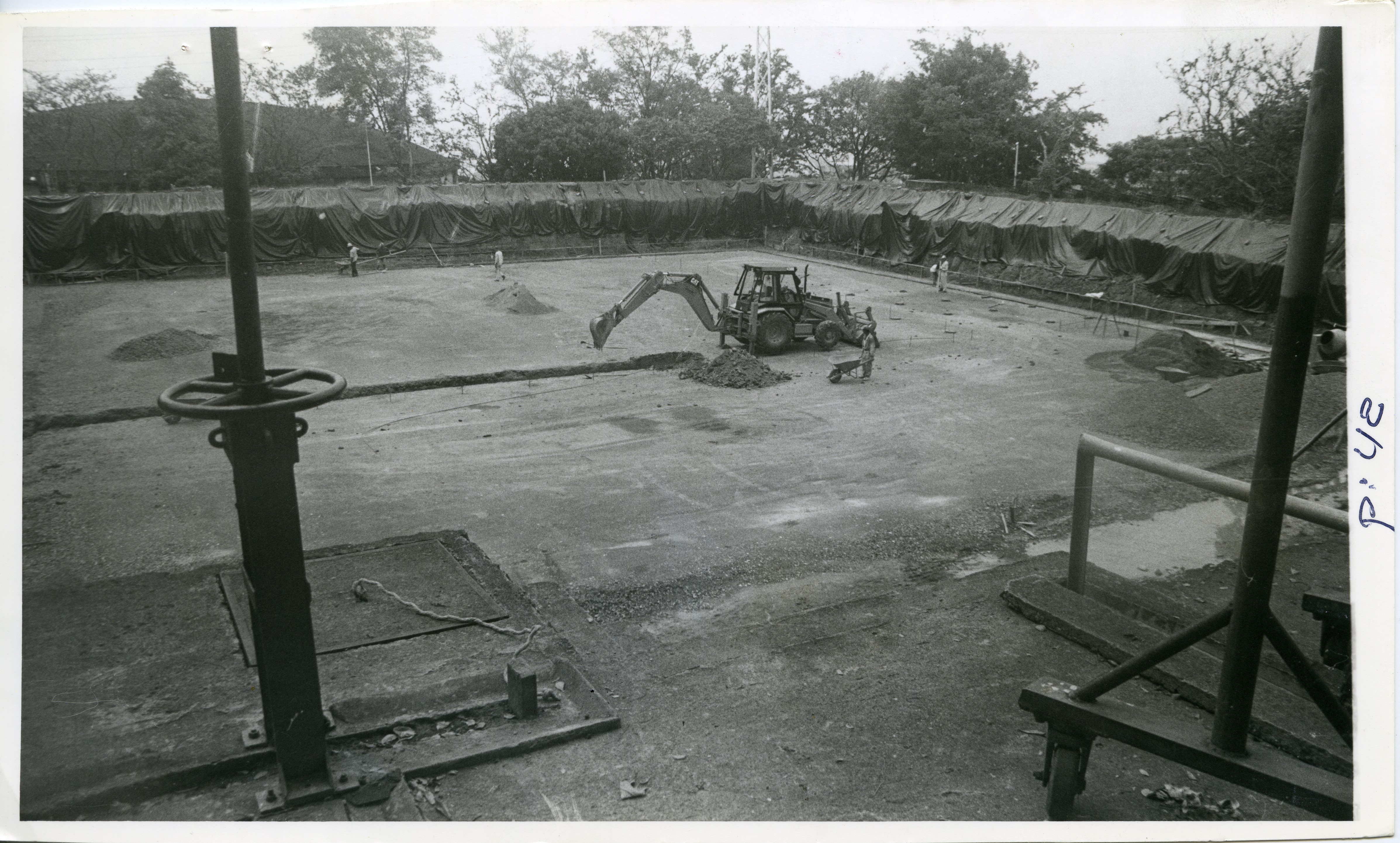 En la fotografía se observan las obras de construcción del acueducto del río Cali. Al reverso hay un recorte de prensa que dice: ¨Con una inversión de $500 millones, la Gerencia de Acueducto y Alcantarillado de Emcali construye el tanque N.1 de la Planta Río Cali. Los trabajos avanzan a un ritmo satisfactorio.¨