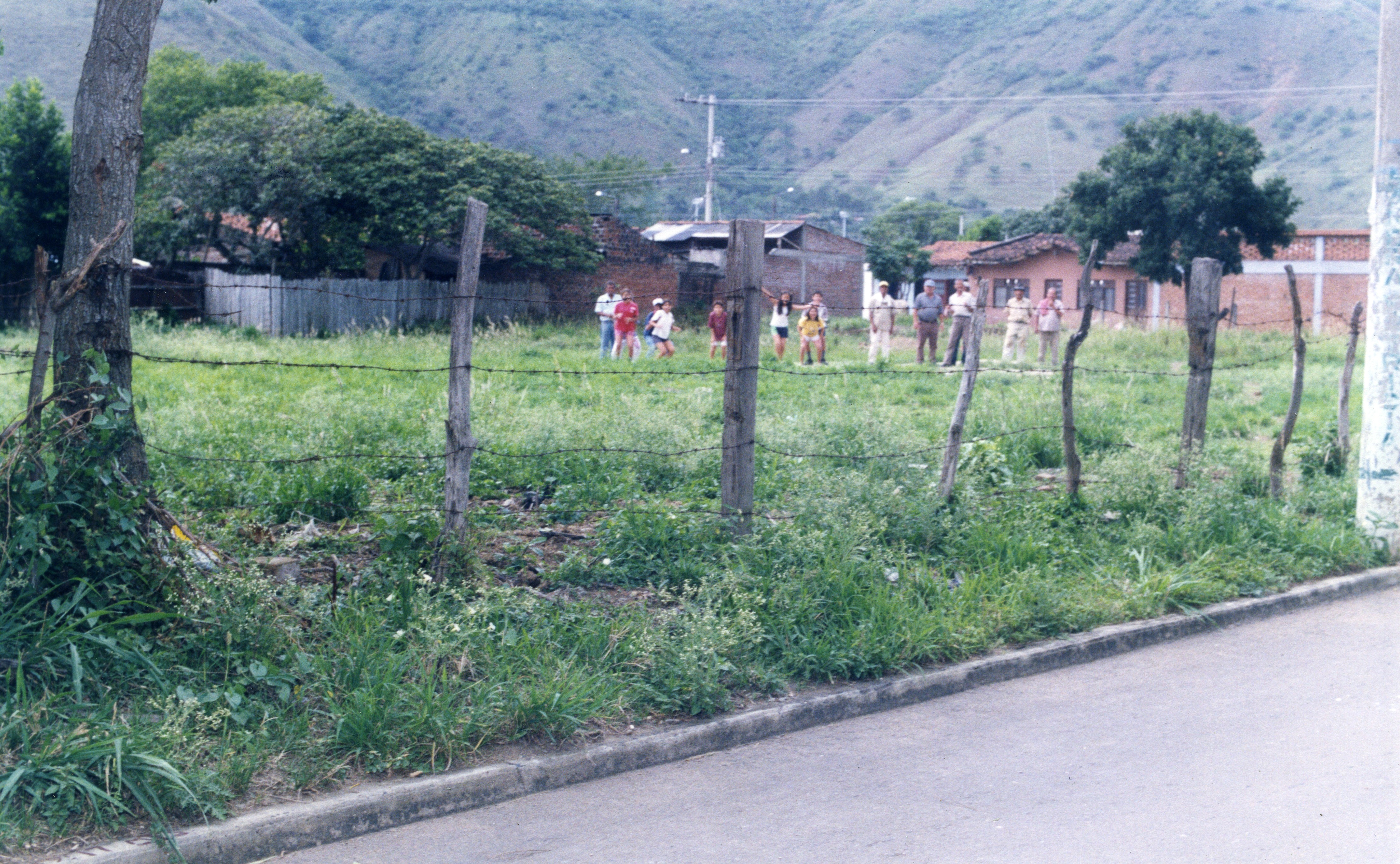 Al reverso de la fotografía se anexa el pie de foto del periódico: "Barrio Robledo: precisamente en el punto que se indica en este lote, será la sede de la primera estación de gasolina, combustibles y lubricantes, la cual generará 16 empleos. Este proyecto cuenta con el respaldo de la Alcaldía Municipal".