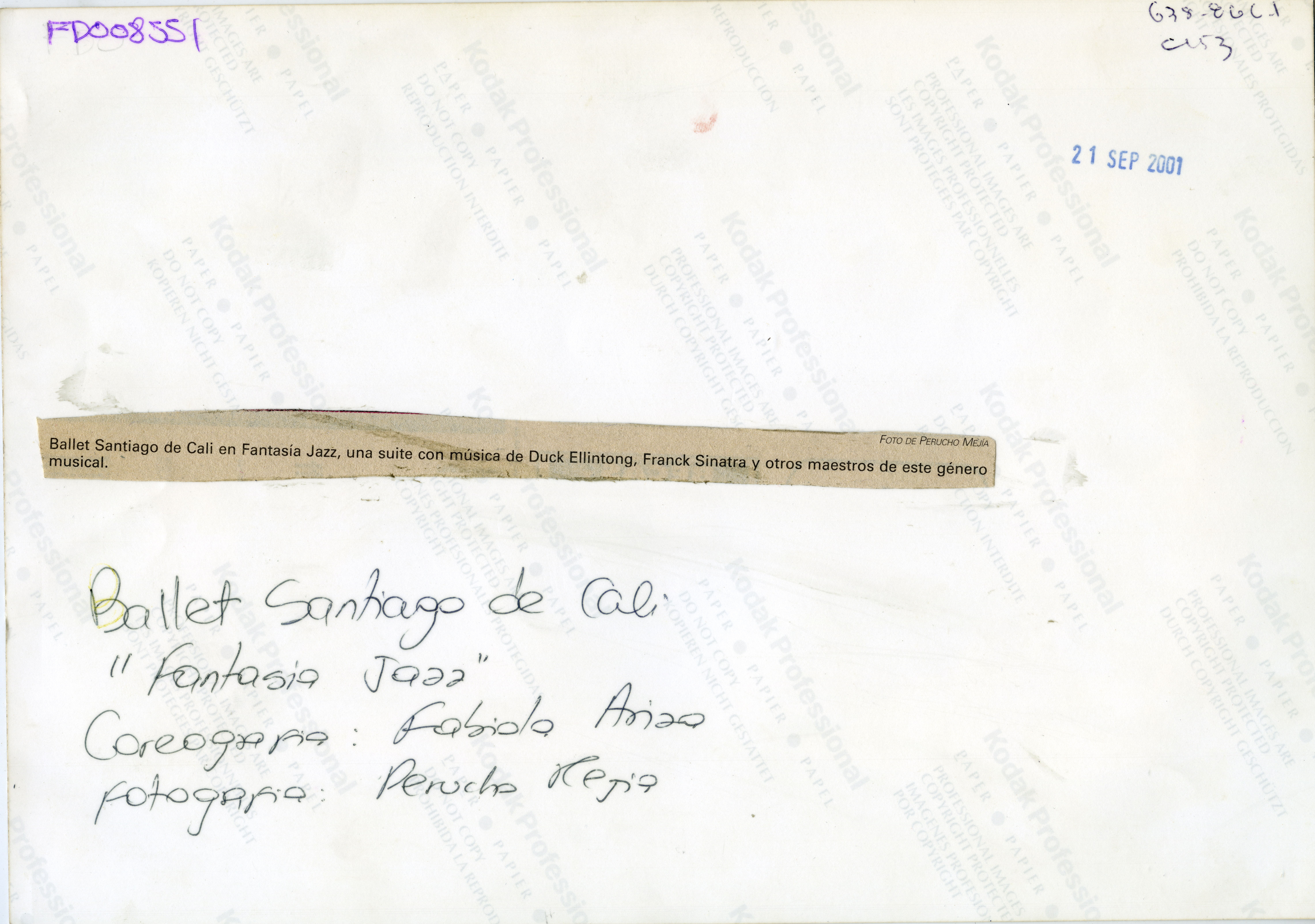 Al reverso de la fotografía se anexa recorte: "Ballet Santiago de Cali en Fantasia Jazz, una suite con músicaa de Duck Ellintong, Frank Sinatra y otros maestros de este género."
