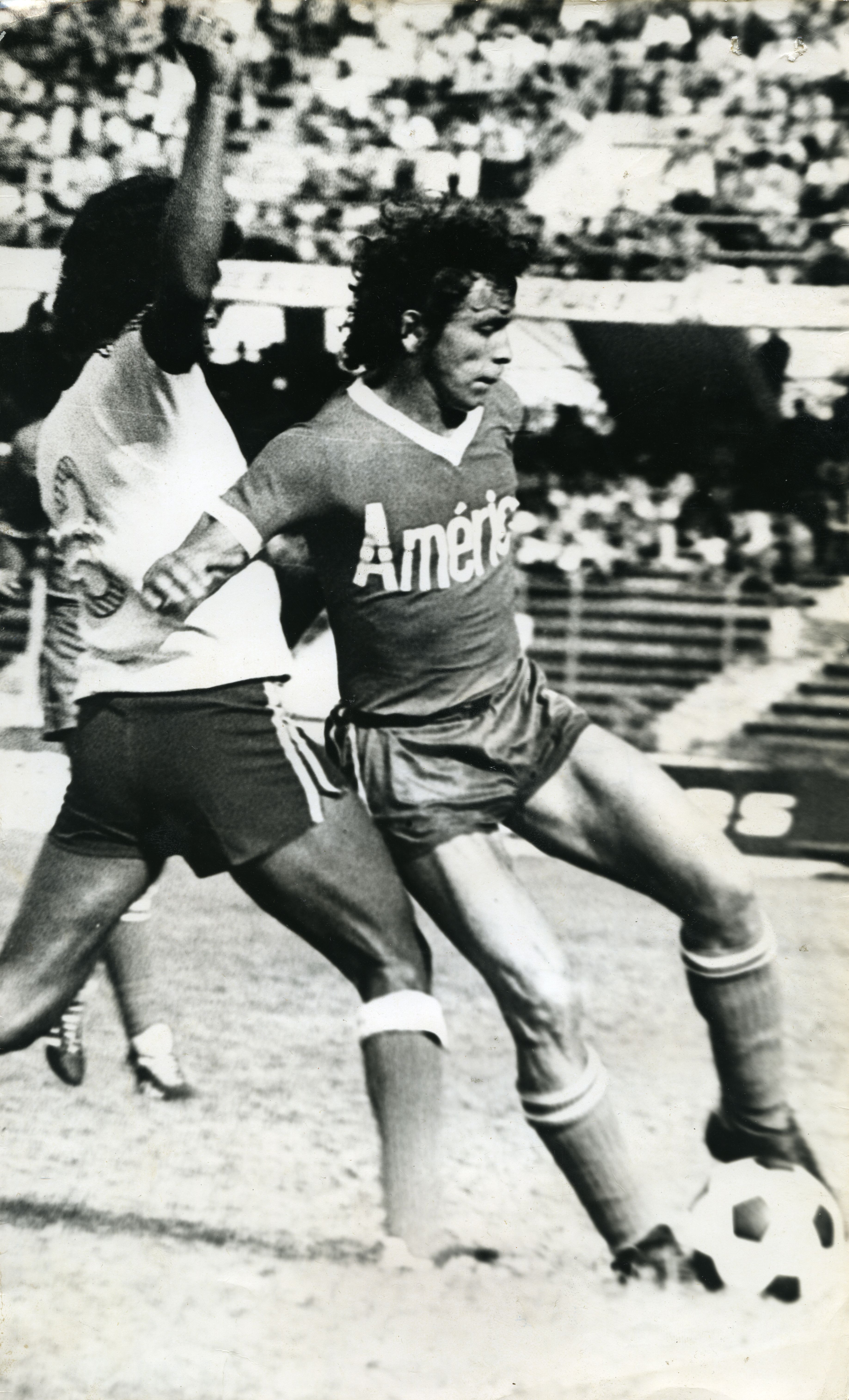 América de Cali, equipo de fútbol de la ciudad de Santiago de Cali, Valle del Cauca. Fue fundado oficialmente en el año 1927. América de Cali y Bucaramanga en partido realizado en el estadio Olímpico Pascual Guerrero. El partido terminó 6-0 con victoria del equipo Américano. Se aprecia en la imagen jugador América domina balón. Observamos público en la tribuna