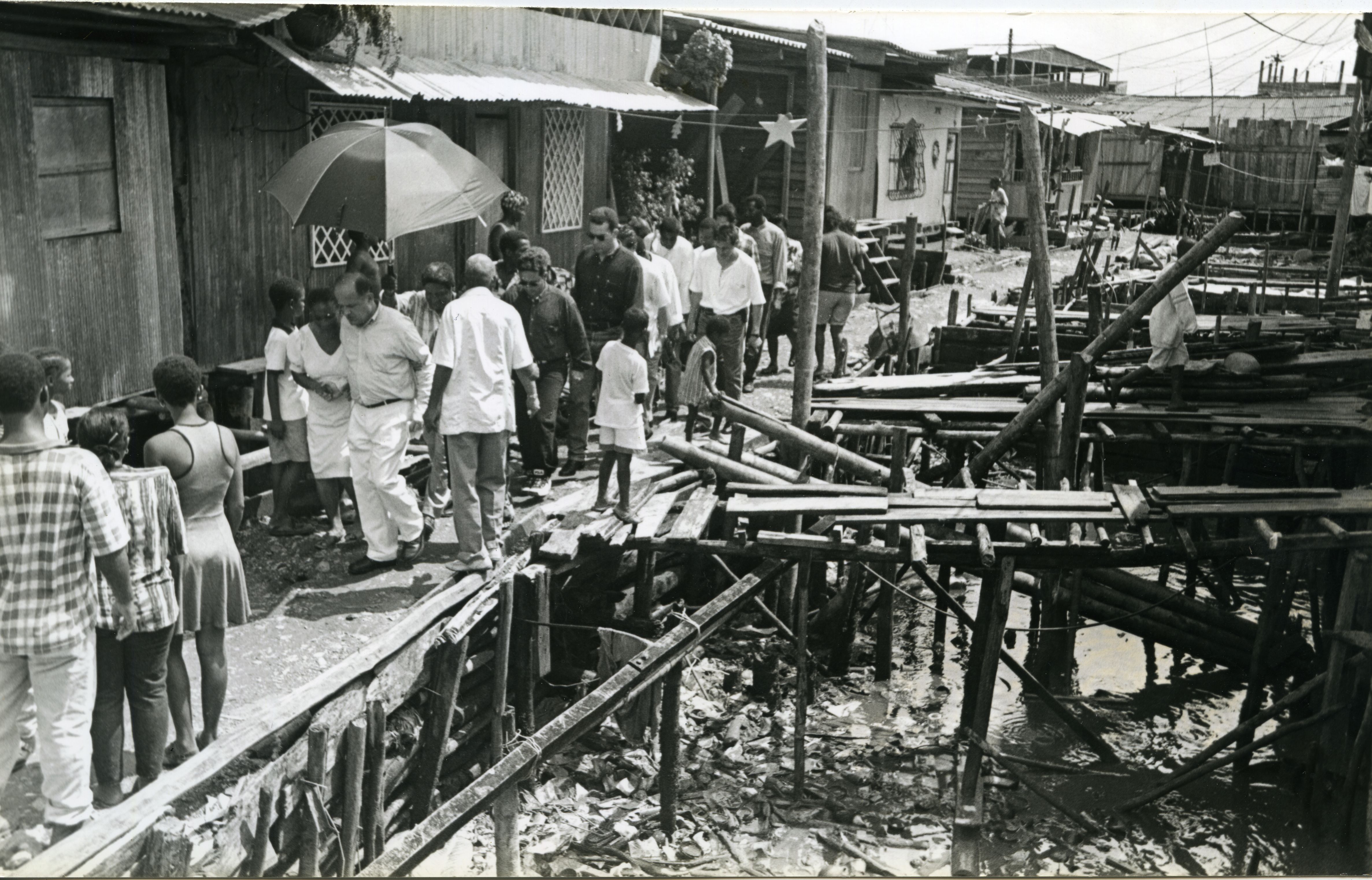 "En la composición gráfica de la imagen se destaca al candidato para la Gobernación Germán Villegas, visitando en compañía, a una comunidad de la ciudad de Buenaventura. La localidad visitada esta construida sobre un cuerpo de agua. "