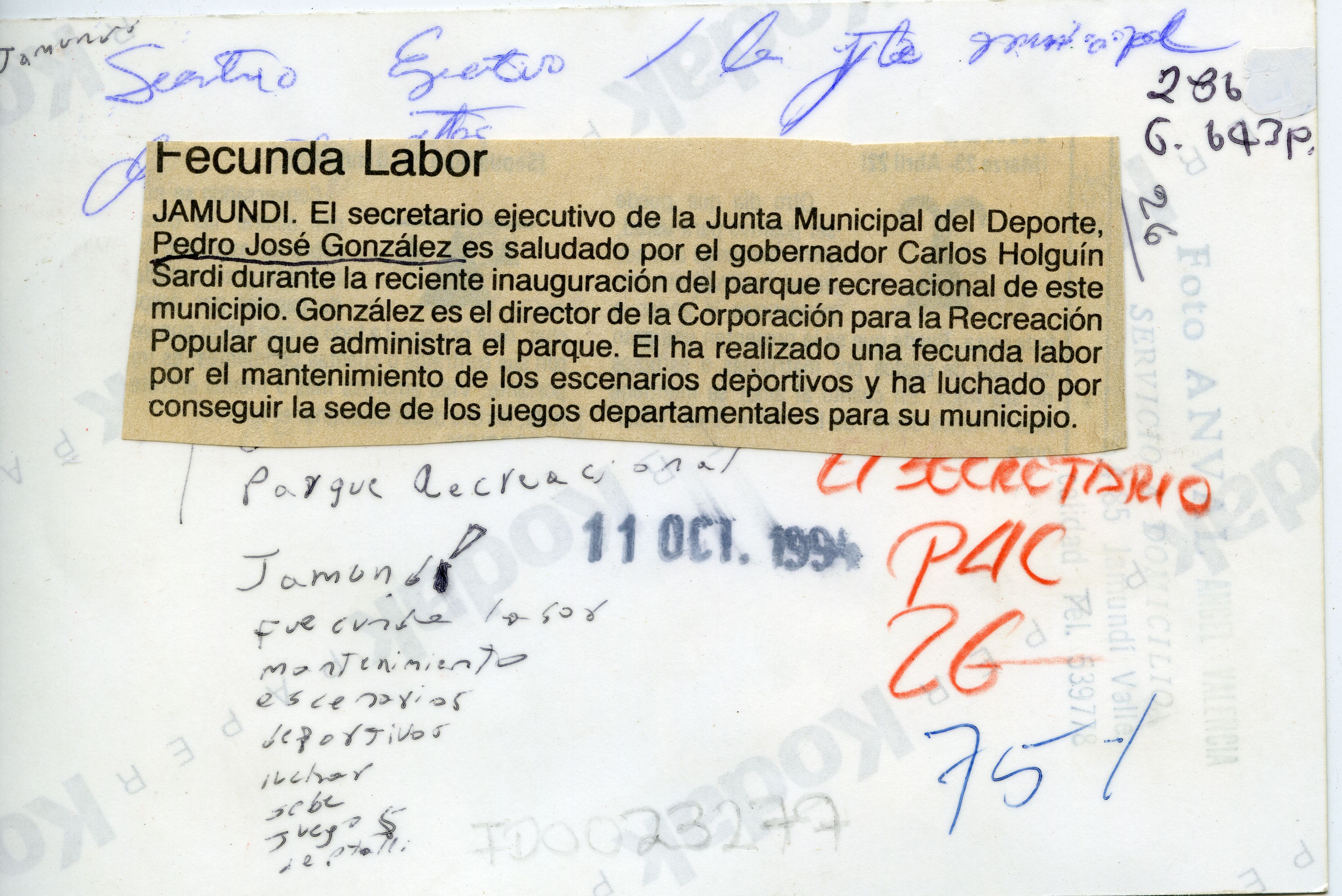 Al reverso de la fotografía se anexa recorte: Jamundí. Fecunda labor. El secretario ejecutivo de la junta municipal del deporte, Pedro José González, es saludado por el gobernador Carlos Holguín Sardi durante la reciente inauguración del parque recreacional de este municipio. González es director de la corporación para la recreación popular que administra el parque. El ha realizado una fecunda labor por el mantenimiento de los escenarios deportivos y ha luchado por conseguir la sede de los juegos departamentales para su municipio