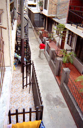 Plano general. Toma en picado. Pasaje entre residencias en el barrio la Rivera. Una mujer camina en el plano medio. Exterior día.
