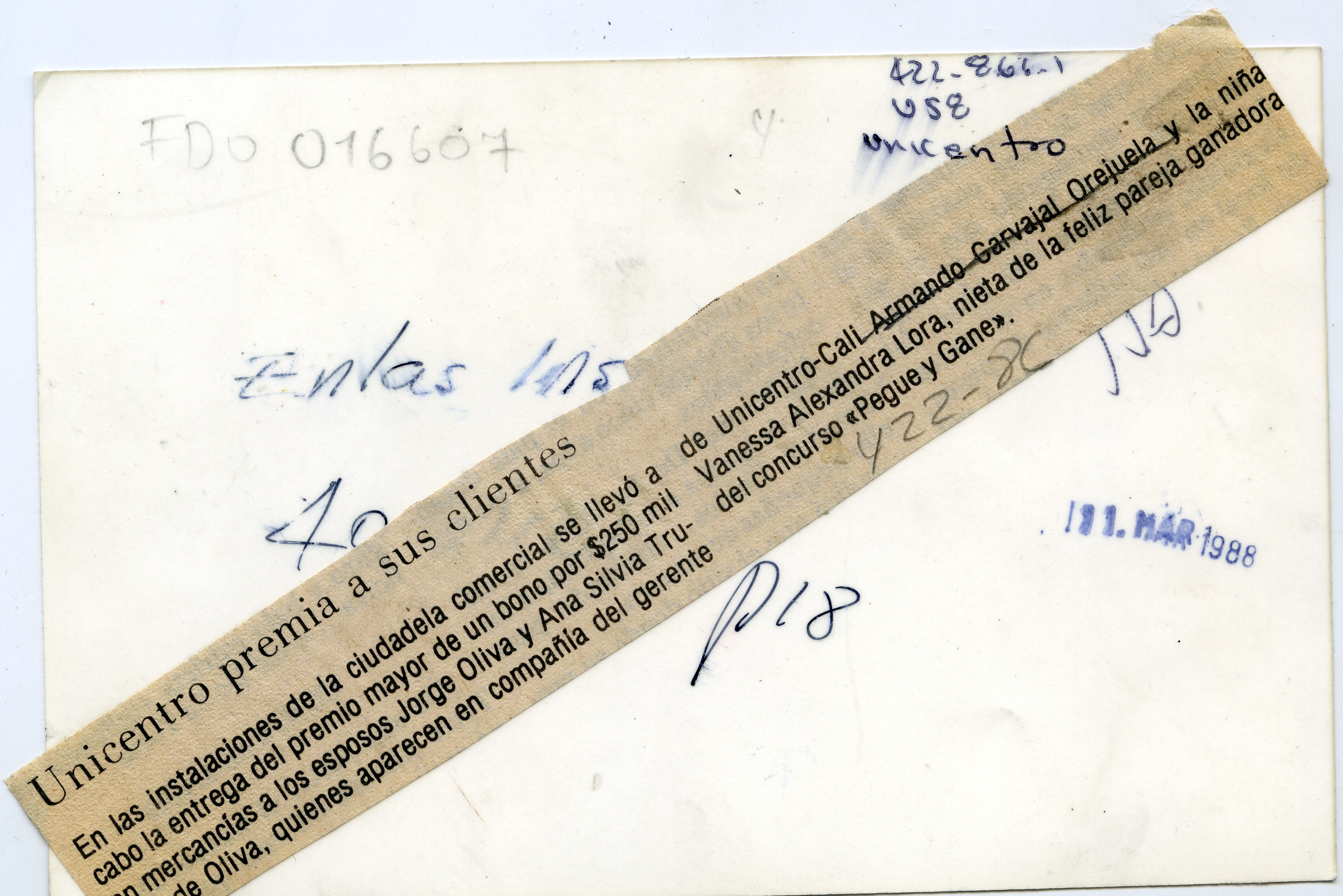 Al reverso de la fotografía se anexa recorte: "Unicentro premia a sus clientes. En las instalaciones de la ciudadela comercial se llevó a cabo la entrega del premio mayor de un bono por $250 mil en mercancías a los esposos Jorge Oliva y Ana Silvia Trujillo de Oliva, quienes aparecen en compañía del gerente de Unicentro-Cali, Armando Carvajal Orejuela y la niña Vanessa Alexandra Lora, nieta de la feliz pareja ganadora del concurso "Pegue y gane"."