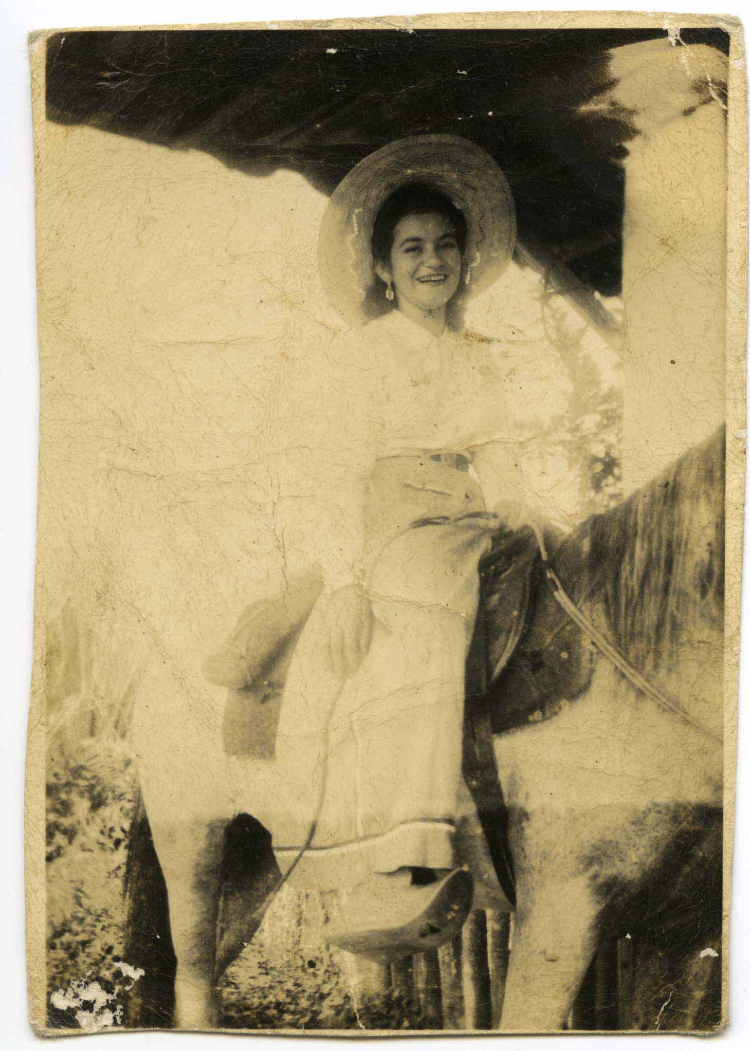 Argelia, Valle del Cauca. Fundado en 1904, por Manuel Mejía, José Antonio Murillo, Epifanio Chávez y Justiano Hincapié. Municipio desde 1956. Se aprecia la Dama Fabiola Quiceno montada en su caballo. Observamos el vestuario de la mujer