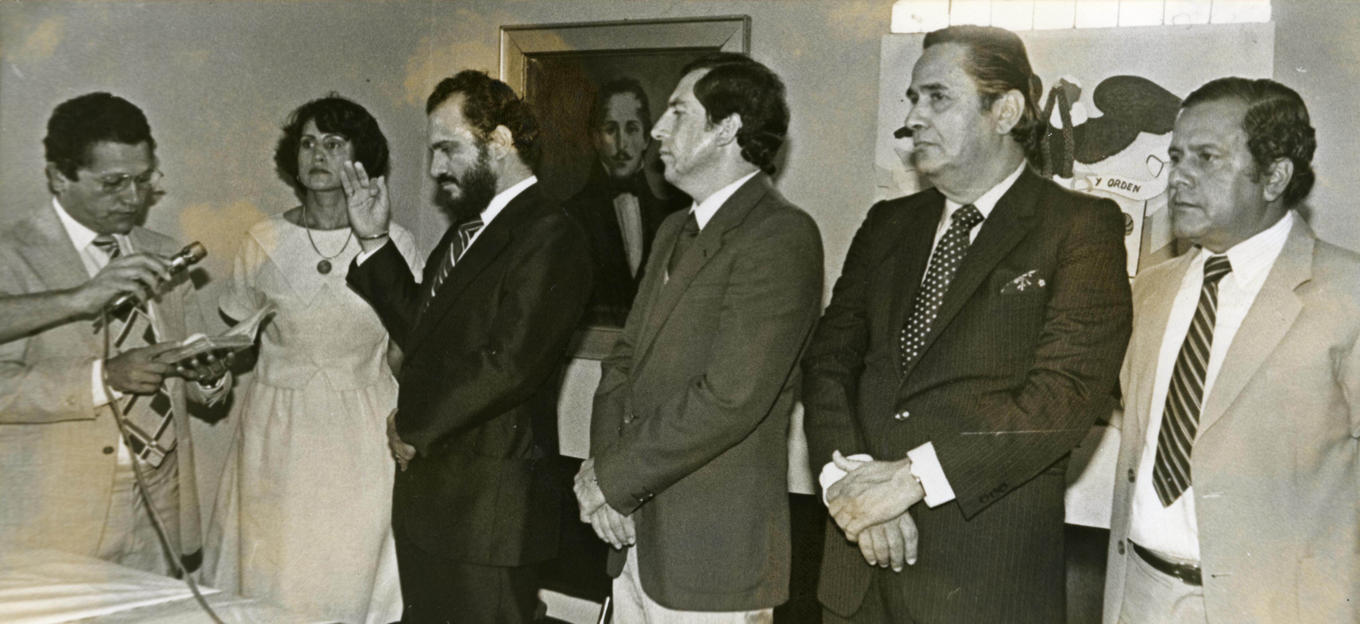 El nuevo alcalde de Zarzal, Ramon Ignacio Atehortua, aparece aqui durante el juramento de rigor. Lo acompañan, entre otros, el gobernador encargado, Gerardo Zuñiga Sanchez y el senador Carlos Holmes Trujillo. Fotografia tomada el 20 Abril de 1985. El Archivo del Patrimonio Fotográfico y Fílmico del Valle del Cauca es responsabilidad de la Biblioteca Departamental del Valle Jorge Garcés Borrero, por convenio de cooperación suscrito con la Secretaria del Cultura Departamental, con el fin de aunar esfuerzos para su conservación, preservación y divulgación del Archivo entre la comunidad Vallecaucana, especialmente entre los estudiantes e investigadores que visitan la Biblioteca, propiciando el su uso y consulta permanente. La universidad Icesi es un colaborador en el proceso de difusión, facilitando la tecnología que permite la consulta de las imágenes