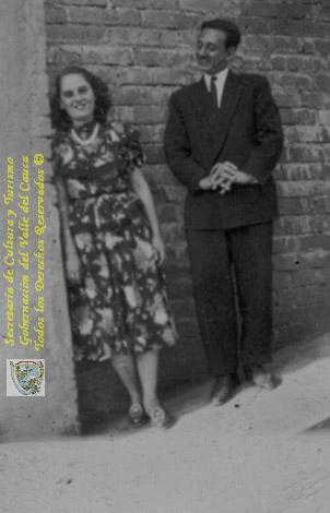 Jesús Alvárez y Rosmira Velásquez, en espera a la llegada del autobus a las afueras del pueblo. Restrepo,1942