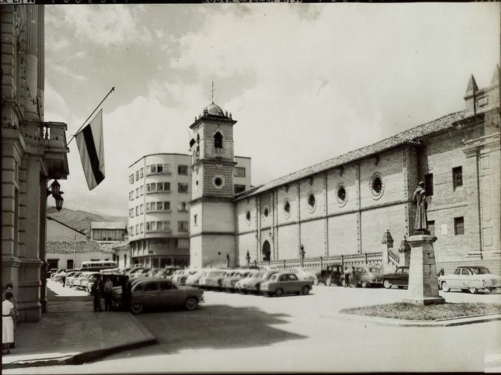 Torre Múdejar, Iglesia y plazoleta de San Francisco, a su alrededor las berlinas de la época. Santiago de Cali, 1956.