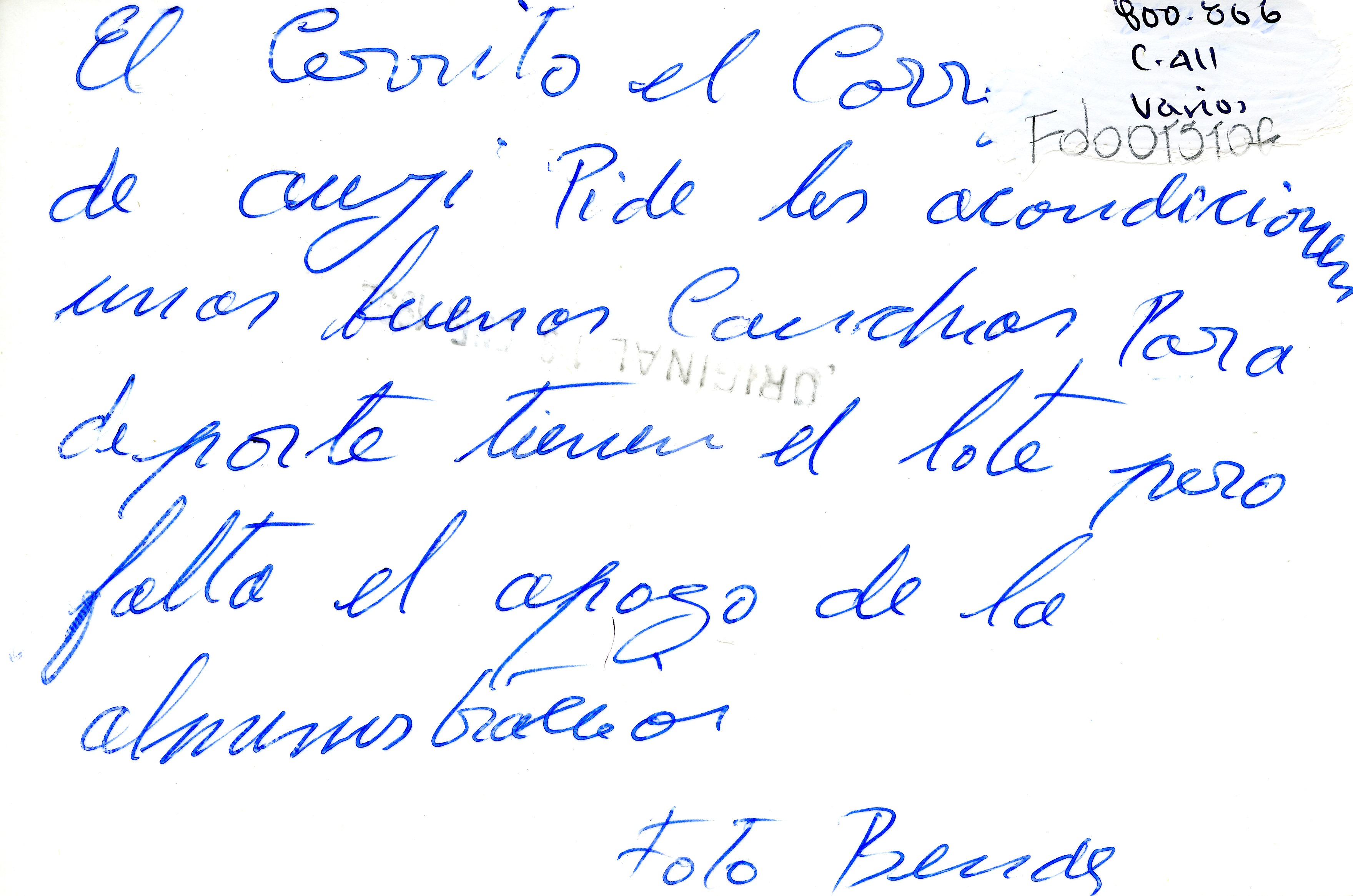 Centro deportivo para la recreación en el corregimiento de Auji. Al reverso de la fotografía se anexa el pie de foto del periódico:"E Cerrito, el corregimiento de Auji pide les acondicionen unas buenas canchas para deporte, tienen el lote pero falta el apoyo de la administración municipal"
